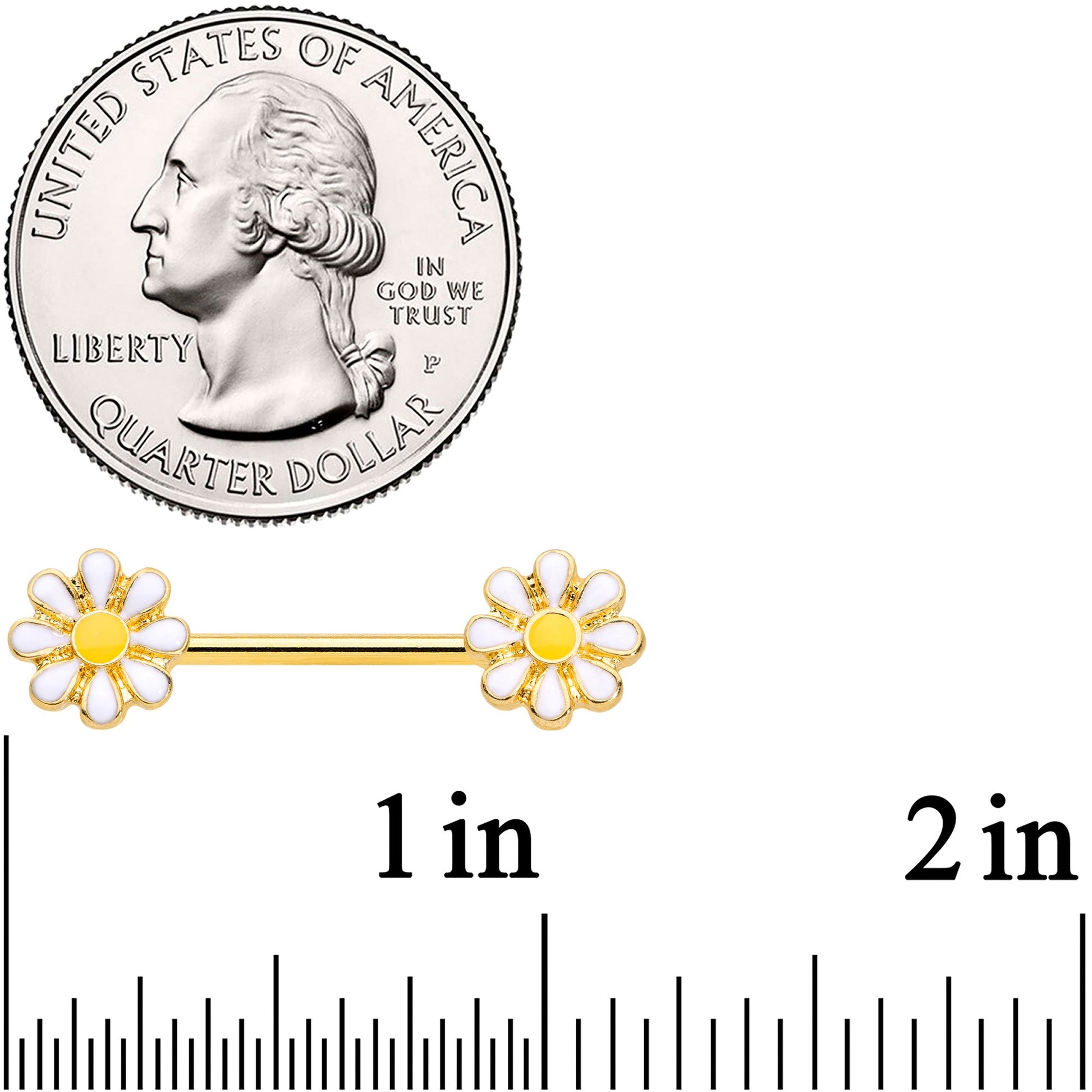 You can't help but get happy with this 14 gauge nipple jewelry! It's made with 14mm gold tone PVD over 316L surgical grade stainless steel straight barbells. Each of the ends features a daisy charm, with the flowers' petals inlaid in white. Each flower has a traditionally yellow center for a look that's upbeat and totally iconic. Be a happy hippie, a grateful gardener, or just feel fabulously floral in this delightful daisy nipple piercing jewelry! Sold as a set of two.Specifications