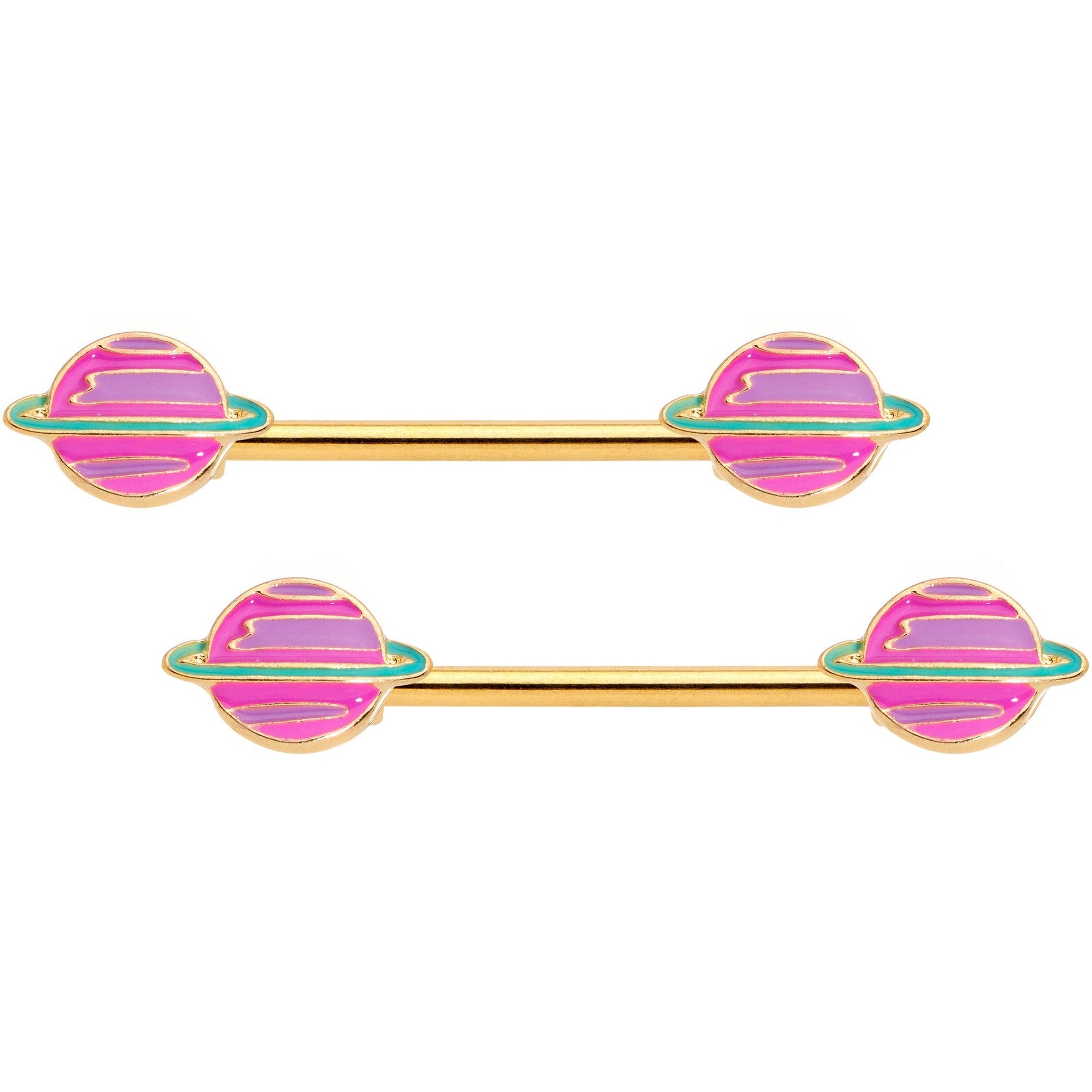 Are you feeling "spaced out" or maybe just have your eyes on the stars? Then these 14 gauge nipple rings are just perfect for you. They're 14mm in length and made with gold tone PVD over 316L surgical grade stainless steel straight barbells. The ends are shaped like the planet Saturn, decked out in brilliant pink and hot purple and ringed in bright green. The overall color scheme is strikingly vivid but not the least bit overwhelming or gaudy. Space is for the bold, just like these boldly colored nipple barbells! Sold as a set of two.Specifications