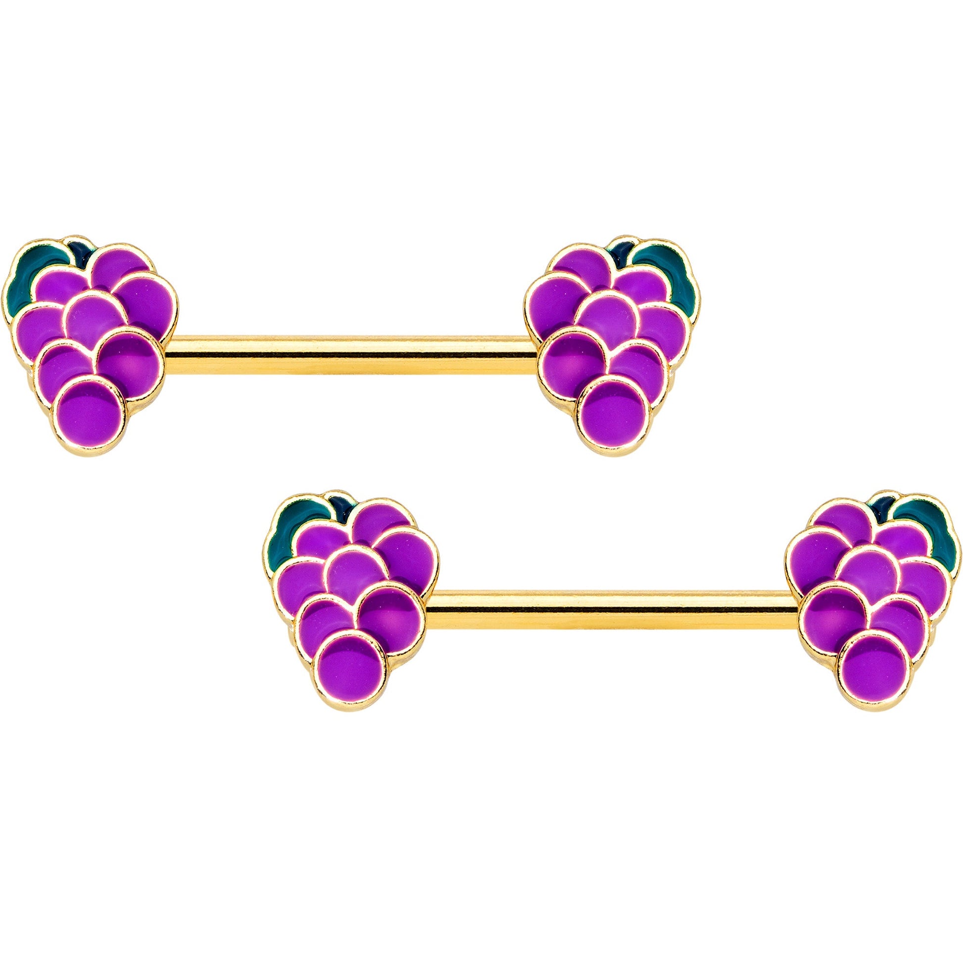 14 Gauge 9/16 Gold Tone Sweet Purple Grapes Barbell Nipple Ring Set