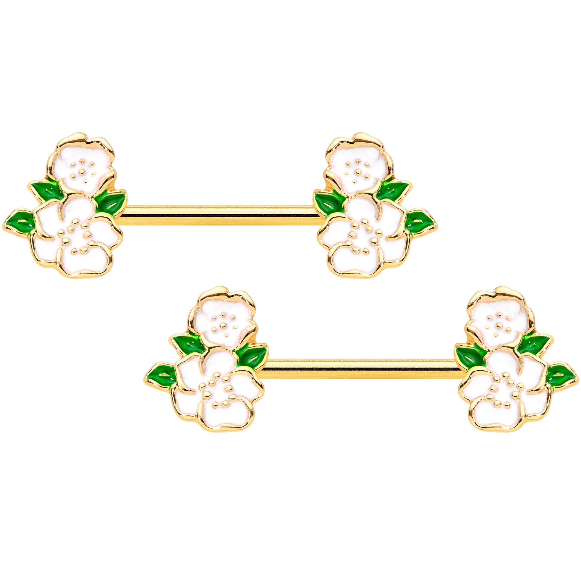 You'll feel absolutely floral with this elegant flower 14 gauge nipple jewelry! It's made with 14mm gold tone PVD over 316L surgical grade stainless steel straight barbells. Each of the ends features a white flower charm that screams spring. They're embellished with green leaves for an added touch of realism. Between the luscious color contrast and splashy styling, these flowers are sure to make an impression! Sold as a set of two.Specifications