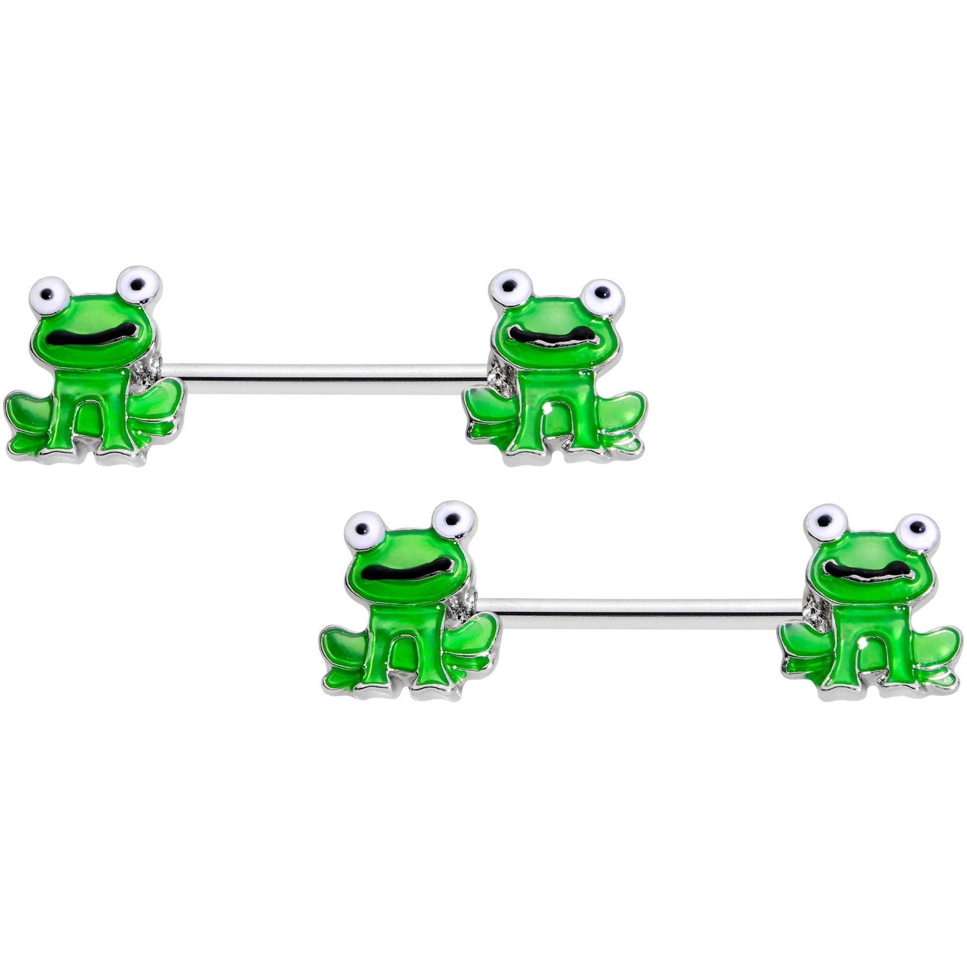 Ribbit? Love it! This four-piece set of 14 gauge nipple jewelry will bring a smile to your face and, under the right circumstances, a glow to your piercings! You get a pair of 14mm durable 316L surgical grade stainless steel straight barbells. The ends feature sweet, smiling green frog charm ends. Their wide eyes and happy smile make for a winningly whimsical look that you won't be able to resist. You also get a pair of 14mm durable 316L surgical grade stainless steel circular barbells with bright green ball ends. The ball ends are UV-reactive and will glow under UV light. Charming little frogs and UV-reactive horseshoes for your nipple piercings? You glow! Sold as a set of four.Specifications
