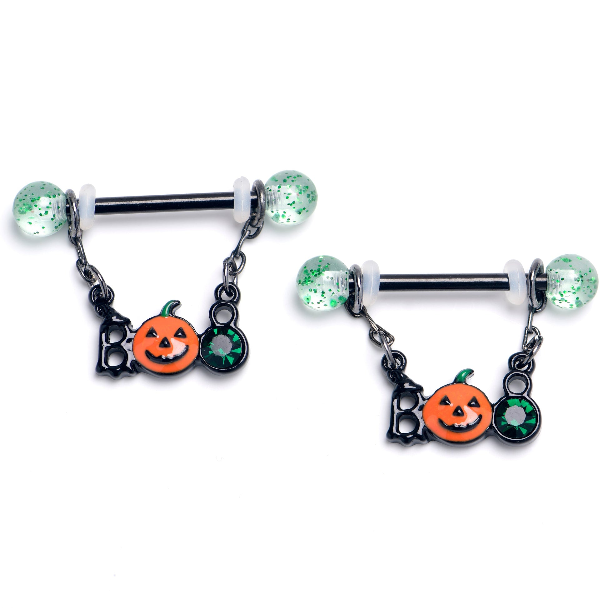 Make every day a Halloween party with this 14 gauge nipple jewelry. It is made with 14mm black PVD over 316L surgical grade stainless steel straight barbells with 5mm green acrylic ball ends. Each barbell features a double length of matching chain that supports a charm of the word boo with the Bs done in elegant gothic style. The Os are jack o'lanterns and the second Os feature deep green gems. You will definitely want to invite these characters to add some Halloween style to your look with these fun and festive nipple piercing rings. Sold as a set of two.Specifications
