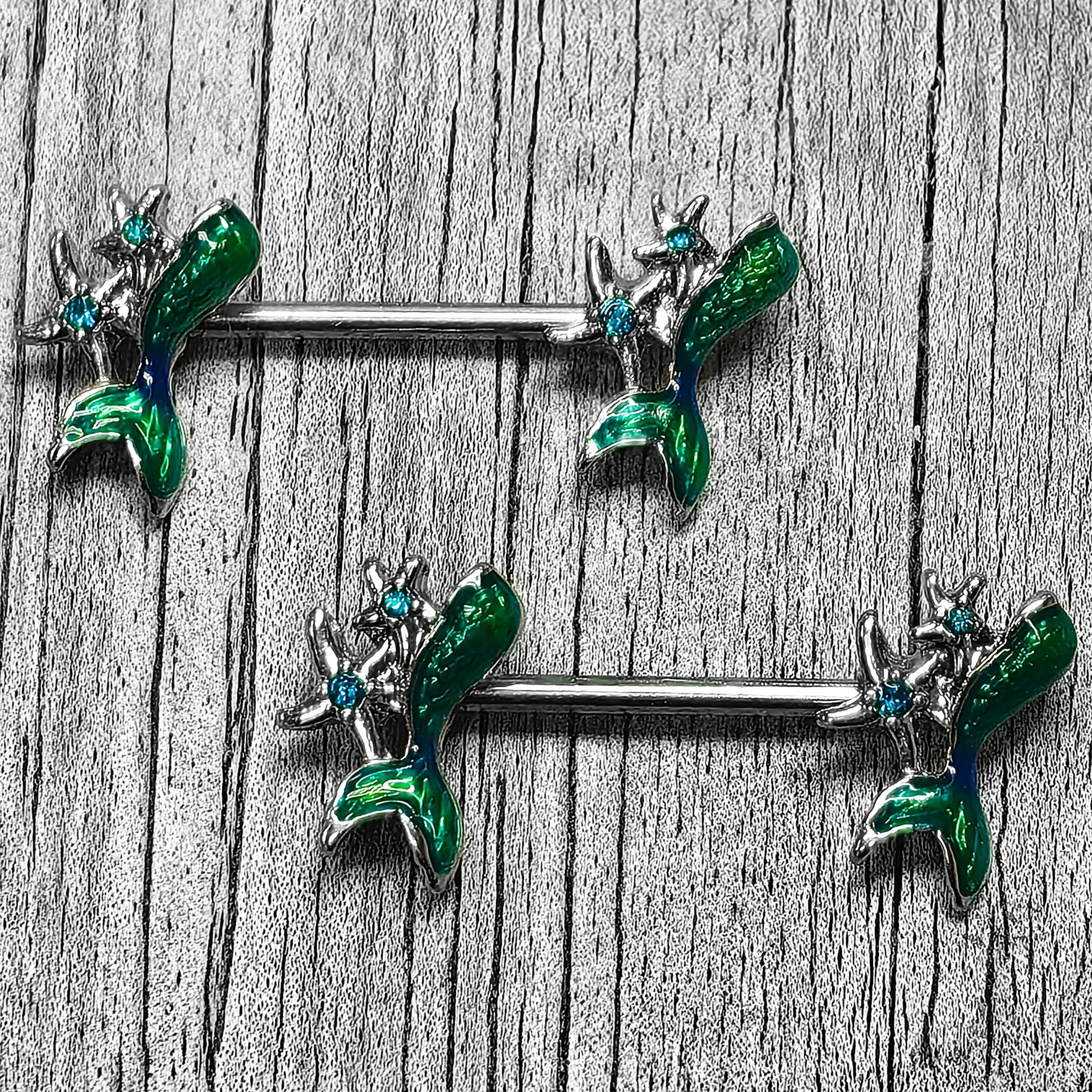 14 Gauge 9/16 Green Gem Blue Mermaid Tail Stars Barbell Nipple Ring Set