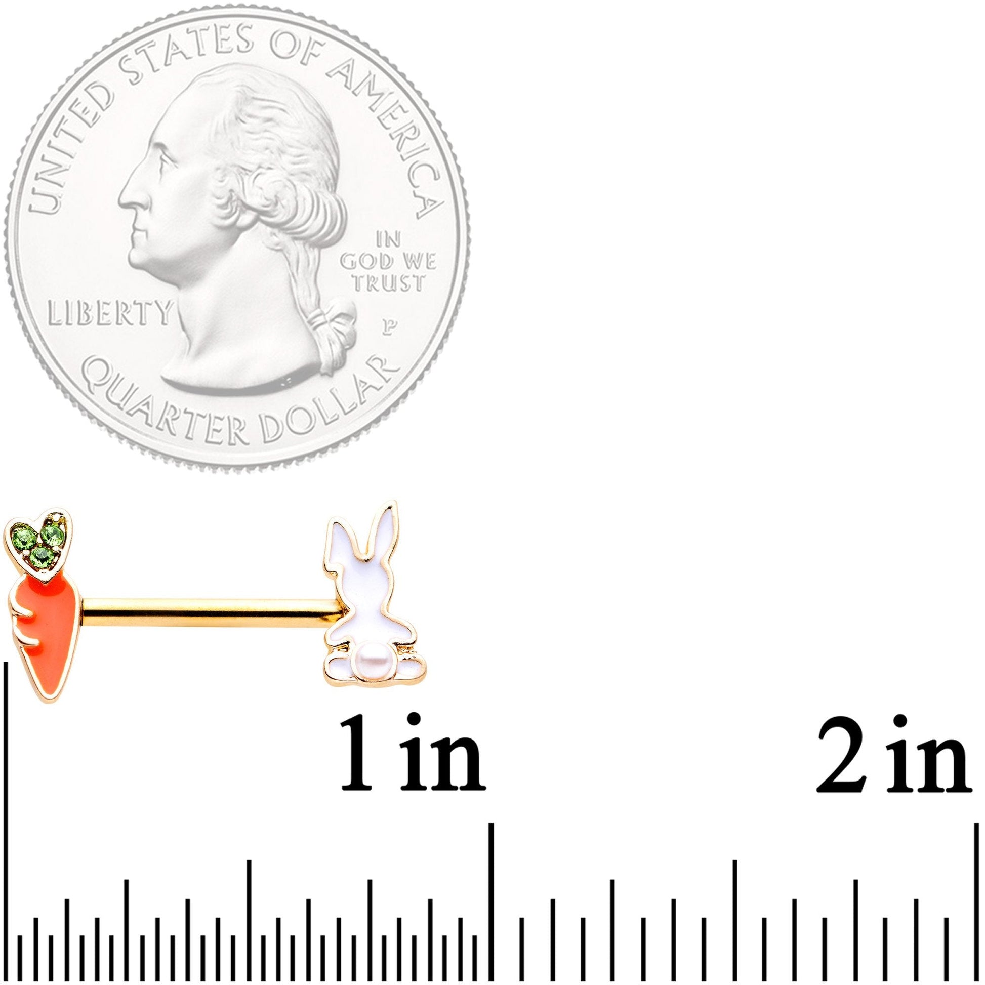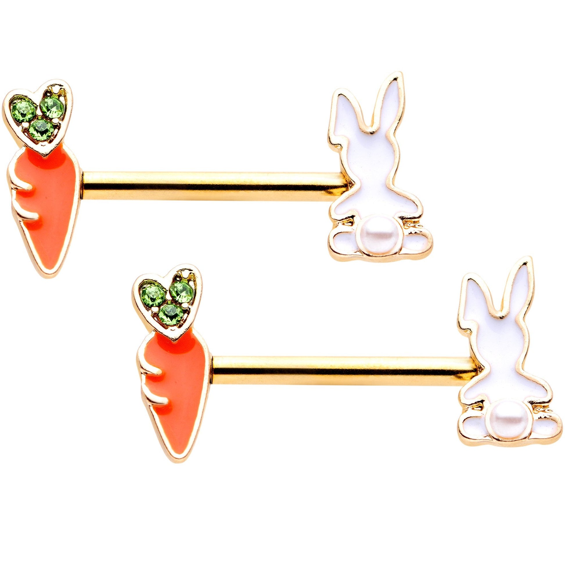 Someone seems to have misplaced their favorite snack on this 14 gauge nipple jewelry! These feature 14mm gold tone PVD over 316L surgical grade stainless steel straight barbells. On one side is the missing munchy, an orange carrot with green gems for leaves. On the opposite side is a white Easter bunny! You'll want these bunnies to hop into your nipple piercings ASAP! Sold as a set of two.Specifications