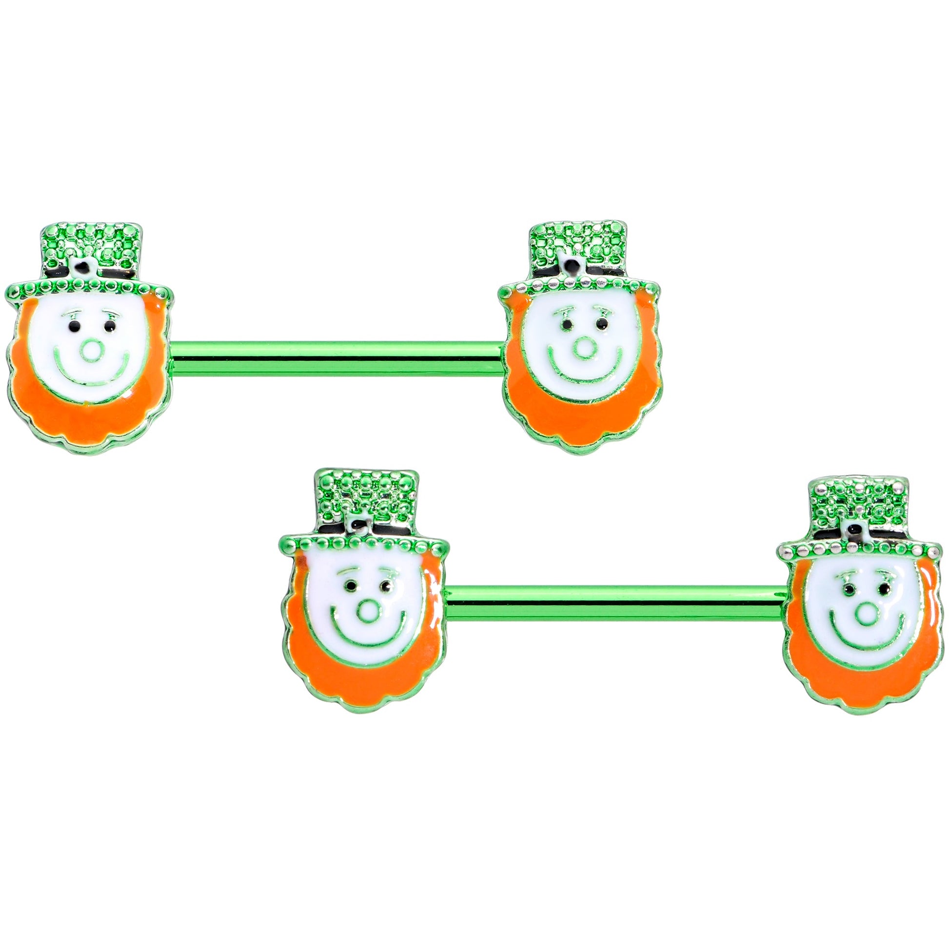 These leprechauns are delighted to grace your nipple piercings from this 14 gauge nipple jewelry! It's made with 14mm green plated over 316L surgical grade stainless steel straight barbells. Each of the ends features a leprechaun charm, each sporting a top hat that's paved with tiny green gems, a red beard and simple, cheerful features for a festive expression that's perfect for St. Patrick's Day! Whether you're Irish or just Irish in spirit, these lovely leprechauns will leave you smiling too! Sold as a set of two.Specifications