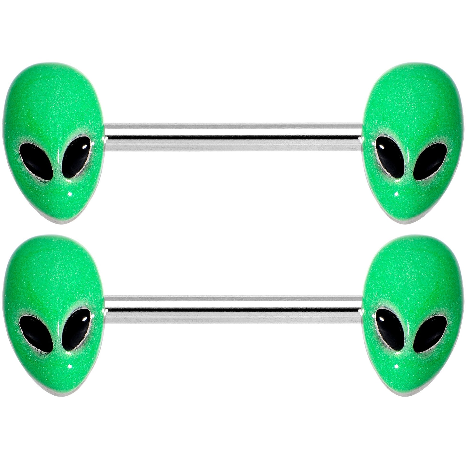 You can tell these aliens are friendly because they're so happy to be here they're positively glowing! These 14 gauge nipple rings are made with 14mm durable 316L surgical grade stainless steel straight barbells. They feature ends shaped like alien faces in green. These aliens have a secret though....turn off the lights and they'll glow in the dark! Now you can show off your piercings without turning on the lights. So glow on and show 'em off! Sold as a set of two.Specifications