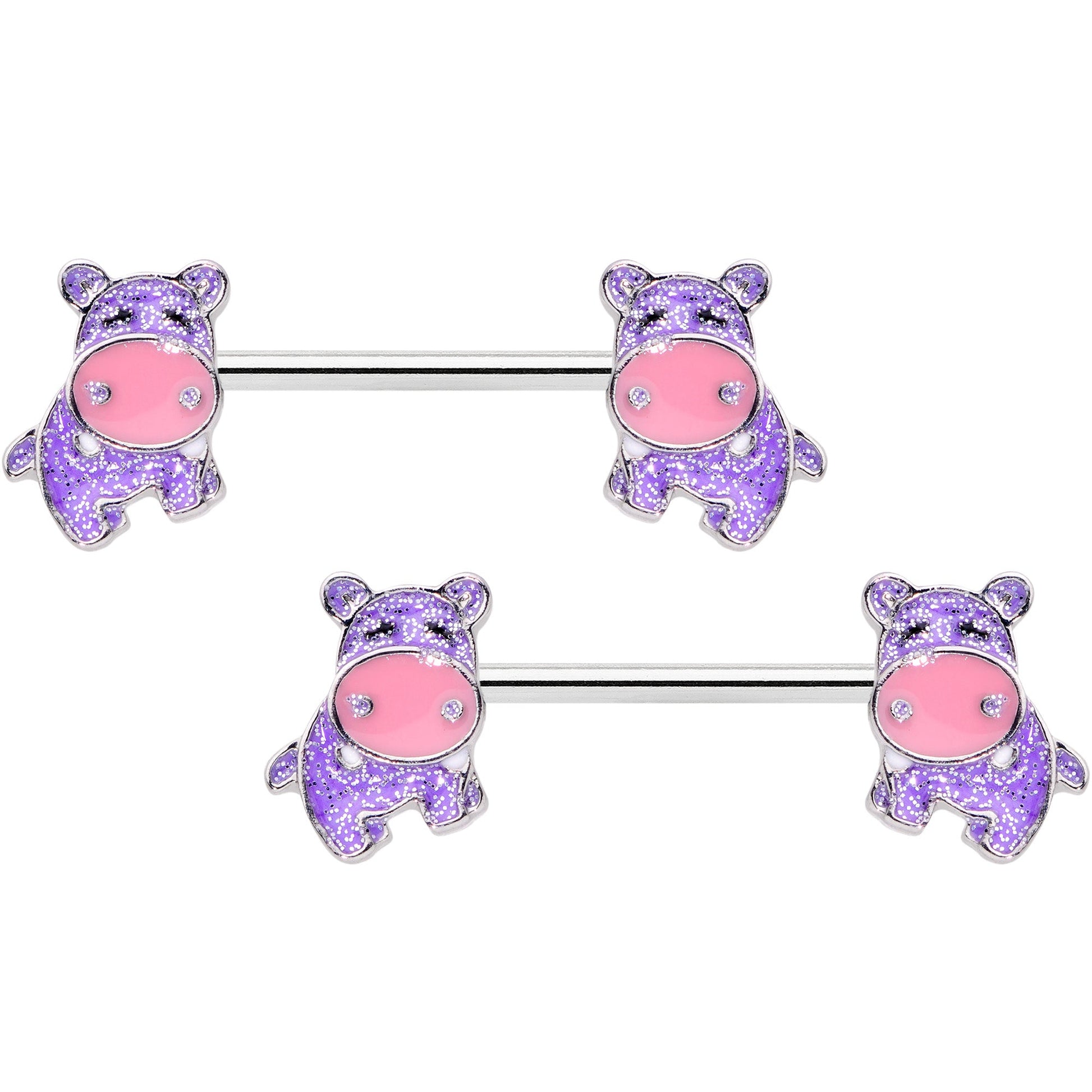 14G 9/16 Happy Purple Hippo Barbell Nipple Ring Set