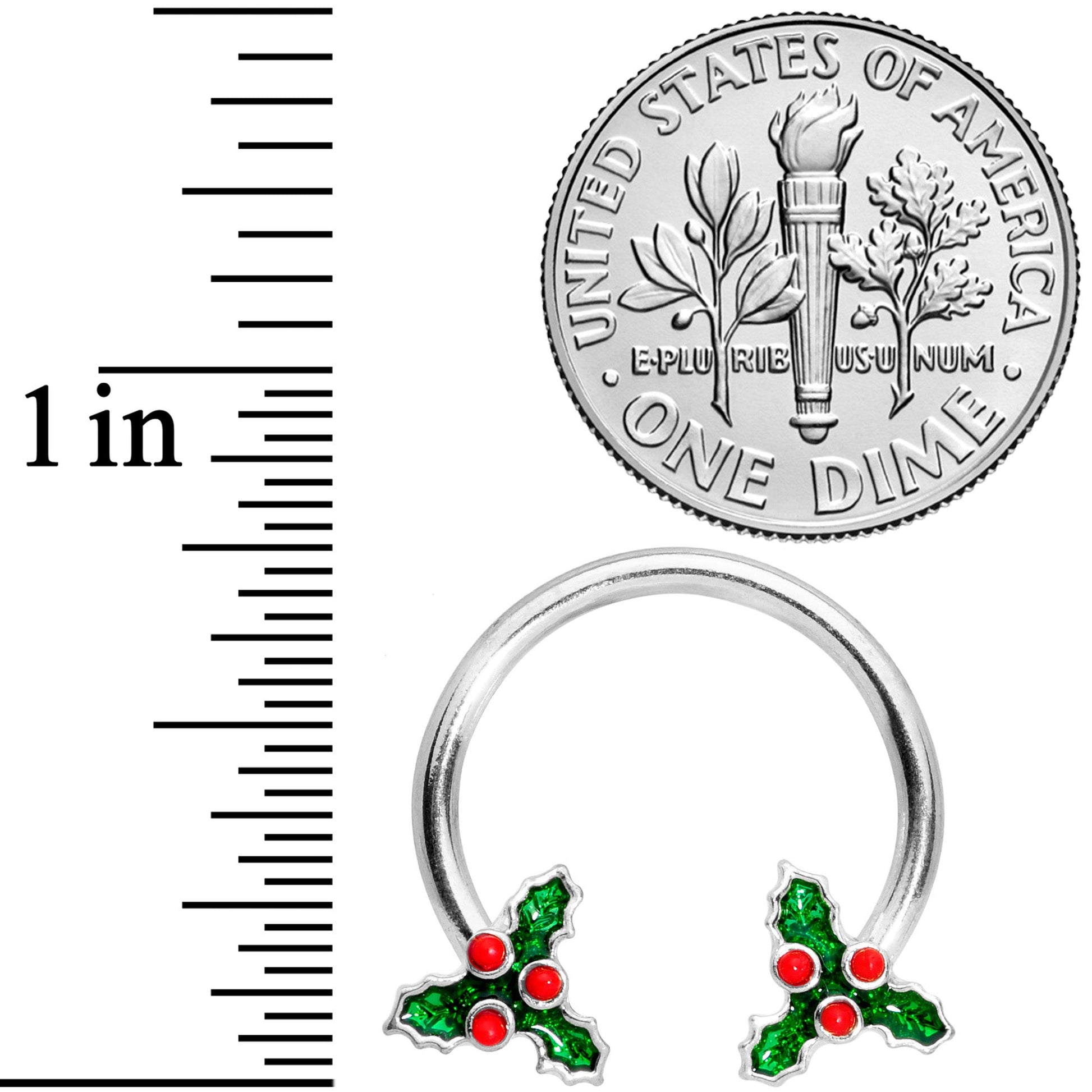 If you're feeling jolly for the holidays, show it off with the sprigs of holly on this 14 gauge nipple jewelry! It's made with 14mm durable 316L surgical grade stainless steel circular barbells. The ends feature green festive sprigs of holly charms with tiny red orbs that represent the berries while adding contrast and visual interest. These horseshoes are sure to put you (and your nipple piercings!) in a merry mood for the holiday season! Sold as a set of two.Specifications