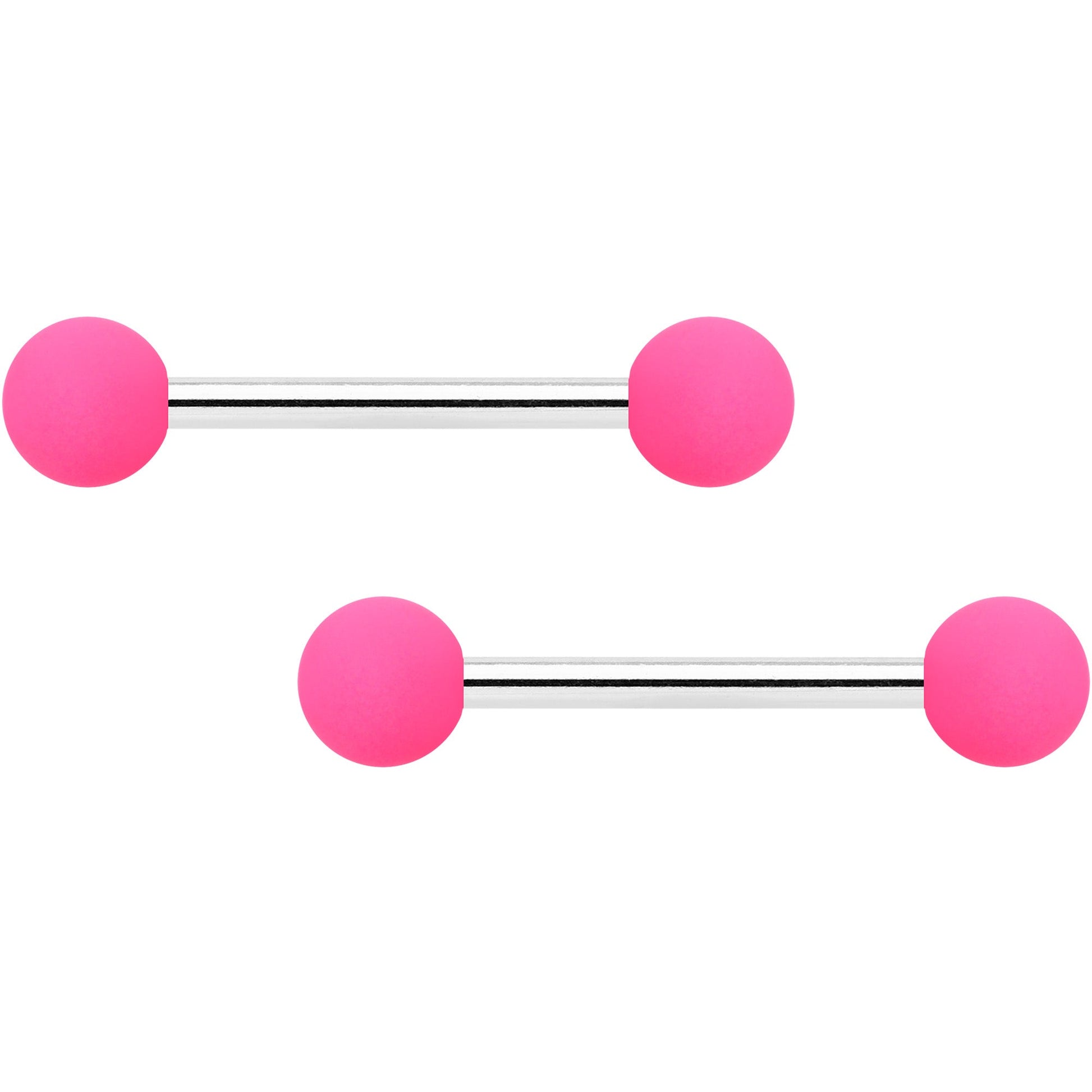 Simple style and powerful color combine to make comfortable and dainty nipple jewelry with these 14 gauge nipple rings! They're made with 14mm durable 316L surgical grade stainless steel straight barbells with 5mm ball ends. One pair has perfectly hot pink ends while the other pair is grey, and both have a subtly soft, matte finish to them. Keep it simple while still keeping it stylish with these colorful matte nipple rings! Sold as a set of four.Specifications