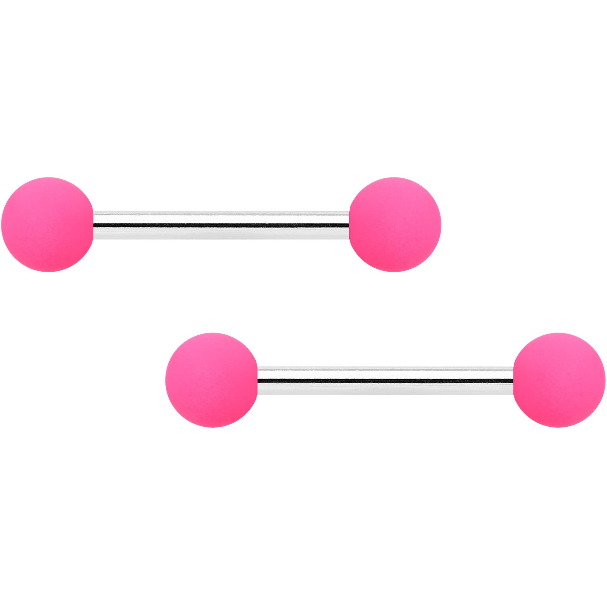 Simple style and hot color combine to make comfortable and sassy nipple jewelry with these 14 gauge nipple rings! They're made with 14mm durable 316L surgical grade stainless steel straight barbells. The 5mm ball ends are shockingly hot pink with a subtly soft, matte finish to them. Keep it simple while still keeping it stylish with these powerfully pink nipple rings! Sold as a set of two.Specifications