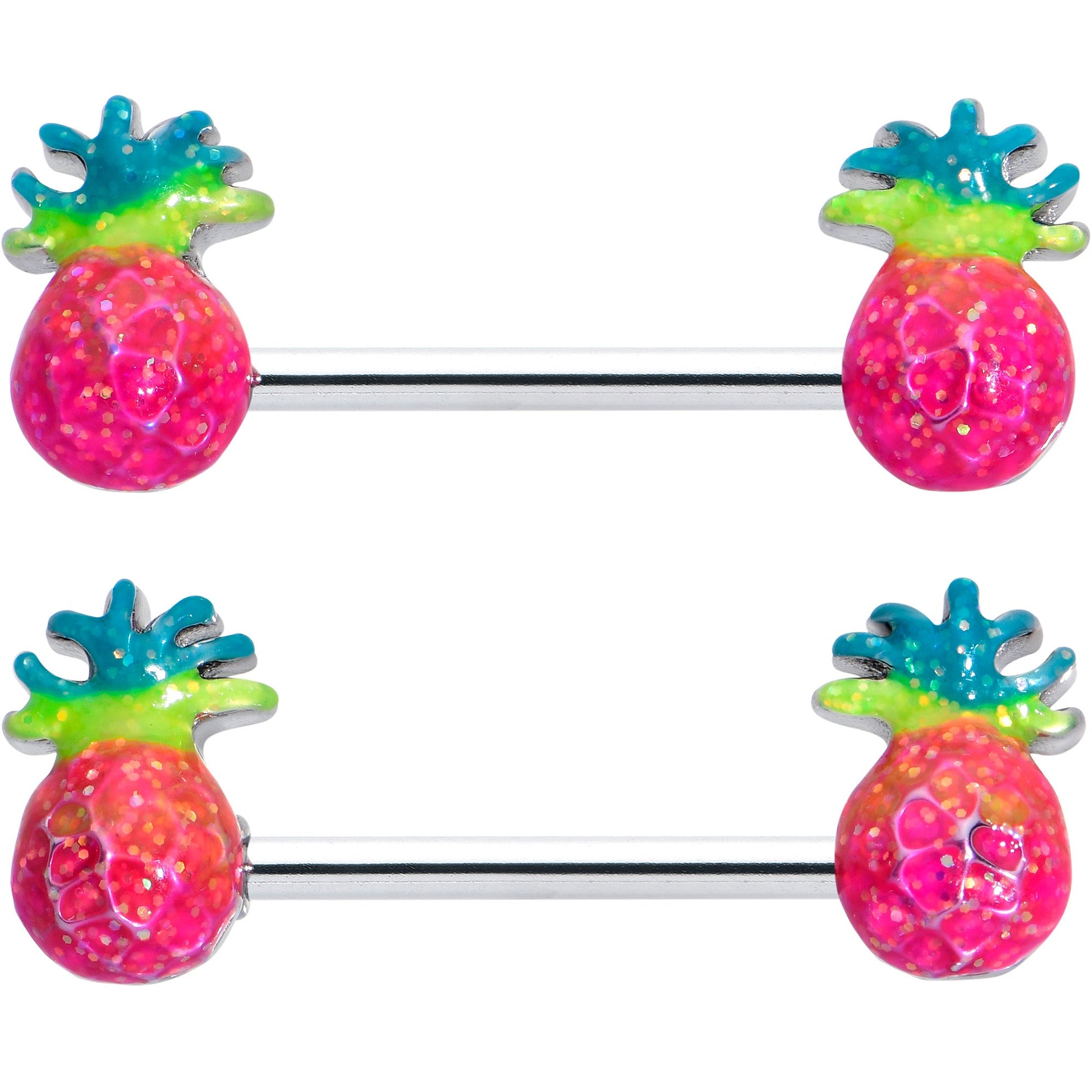 What could be sweeter than the ripe, juicy pineapples on this 14 gauge nipple jewelry? It's made with 14mm durable 316L surgical grade stainless steel straight barbells. Each of the ends features a hot, hot pink fruit, with textured detailing. The pineapples are embellished with yellow tops and blue leaves for a trippy and tasty look. Get hot and juicy and totally sweet with these delicious looking nipple piercing rings. Sold as a set of two.Specifications