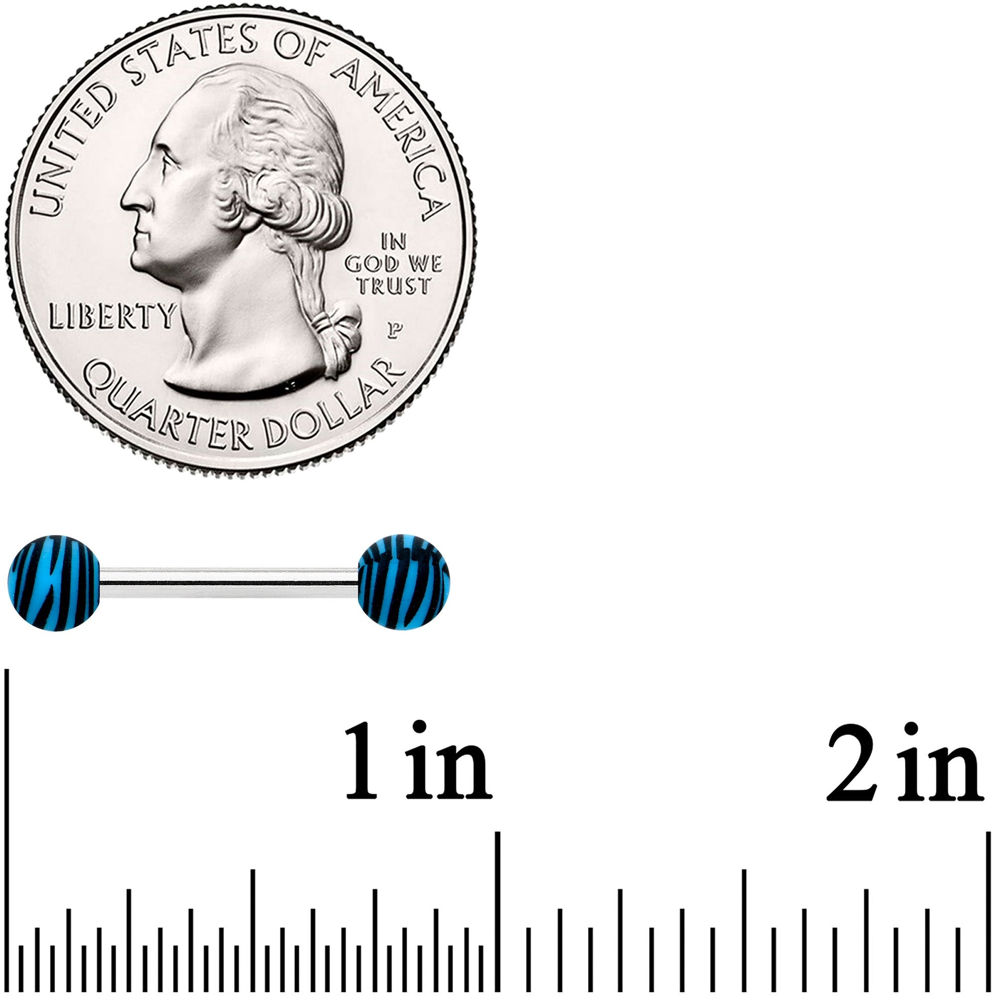 Add some zany zebra style to your look with this 14 gauge nipple jewelry! It's made with 14mm durable 316L surgical grade stainless steel straight barbells with 4mm ball ends. The ball ends are made with acrylic and feature a blue and black zebra-striped pattern. They also feature a matte finish for a look that stands out without overwhelming. You'll definitely love the look of this nipple piercing jewelry! Sold as a set of two.Specifications