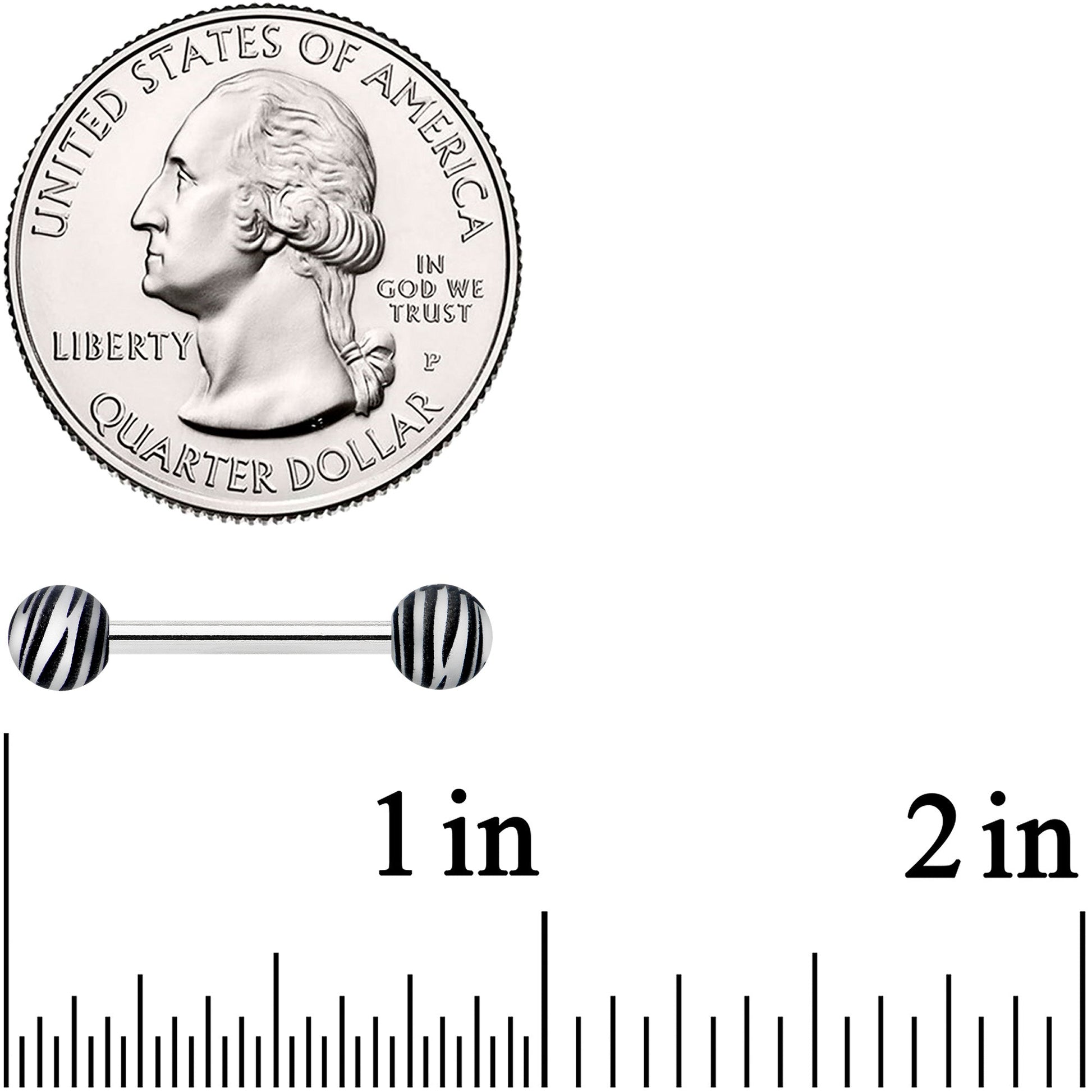 Add some zany zebra style to your look with this 14 gauge nipple jewelry! It's made with 14mm durable 316L surgical grade stainless steel straight barbells with 4mm ball ends. The ball ends are made with acrylic and feature a grey and black zebra-striped pattern. They also feature a matte finish for a look that stands out without overwhelming. You'll definitely love the look of this nipple piercing jewelry! Sold as a set of two.Specifications