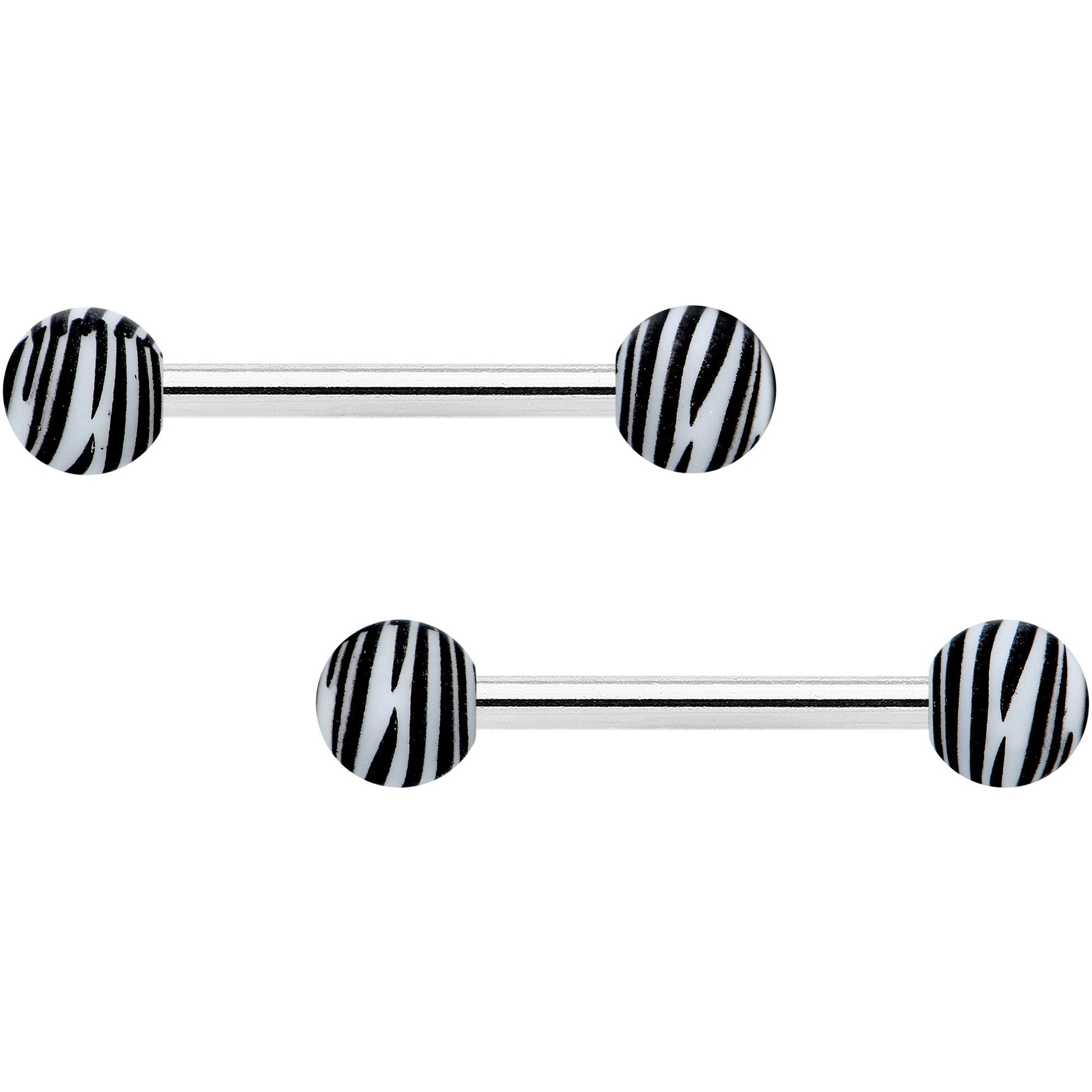 Add some zany zebra style to your look with this 14 gauge nipple jewelry! It's made with 14mm durable 316L surgical grade stainless steel straight barbells with 4mm ball ends. The ball ends are made with acrylic and feature a white and black zebra-striped pattern. They also feature a matte finish for a look that stands out without overwhelming. You'll definitely love the look of this nipple piercing jewelry! Sold as a set of two.Specifications