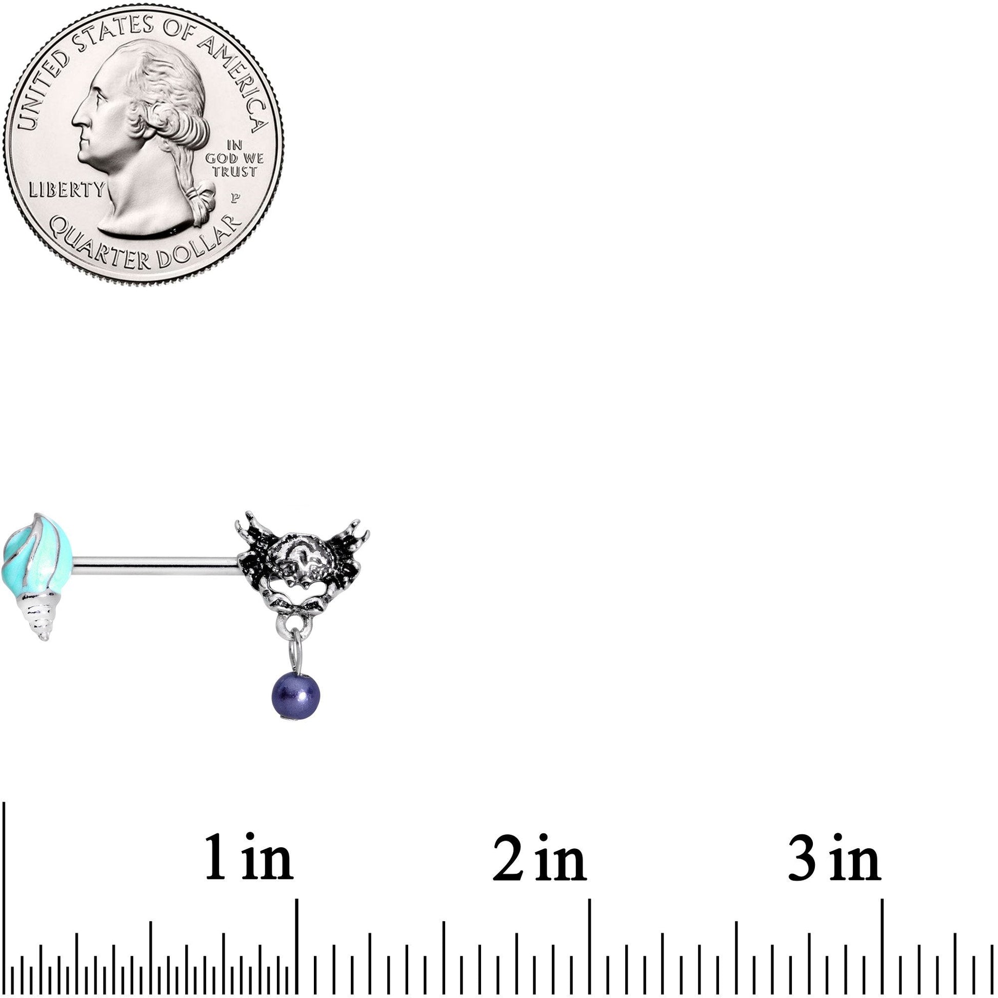 These are some crabs you won't have to go to a seafood restaurant for! These 14 gauge nipple barbells are made with 14mm length durable 316L surgical grade stainless steel straight barbells. One end features a whelk shell comprised of an aqua color orb and fine detailing. The other end is a crab with heavy engraving detail giving it a realistically textured appearance. Dangling from his claws is a small orb in deep navy blue, a perfect foil for the light shade of the other end as well as reinforcing the nautical feel. Time to raise anchor and set sail for the ocean with these beautiful nipple rings! Sold as a set of two.Specifications