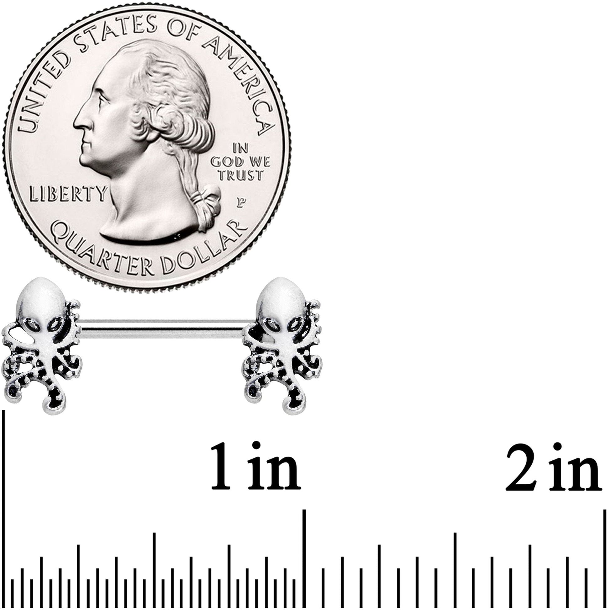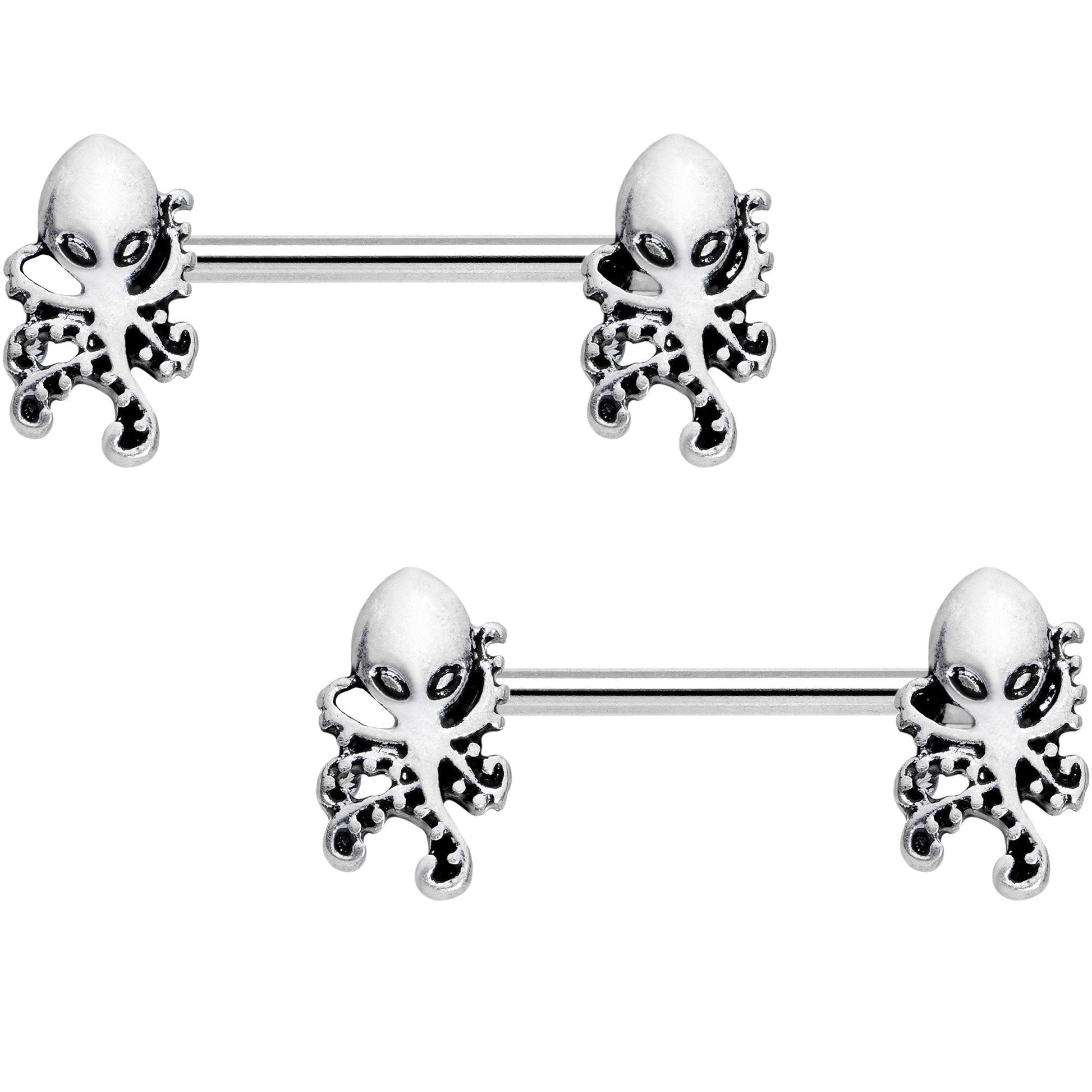 You'll have to be careful not to let anyone get too wound up when you wear these 14 gauge octopus nipple piercings. Made with 14mm durable 316L surgical grade stainless steel straight barbells, this nipple jewelry features octopus ends that will leave your breasts their mysterious best. This set of barbell nipple rings is sold as a set of two.Specifications
