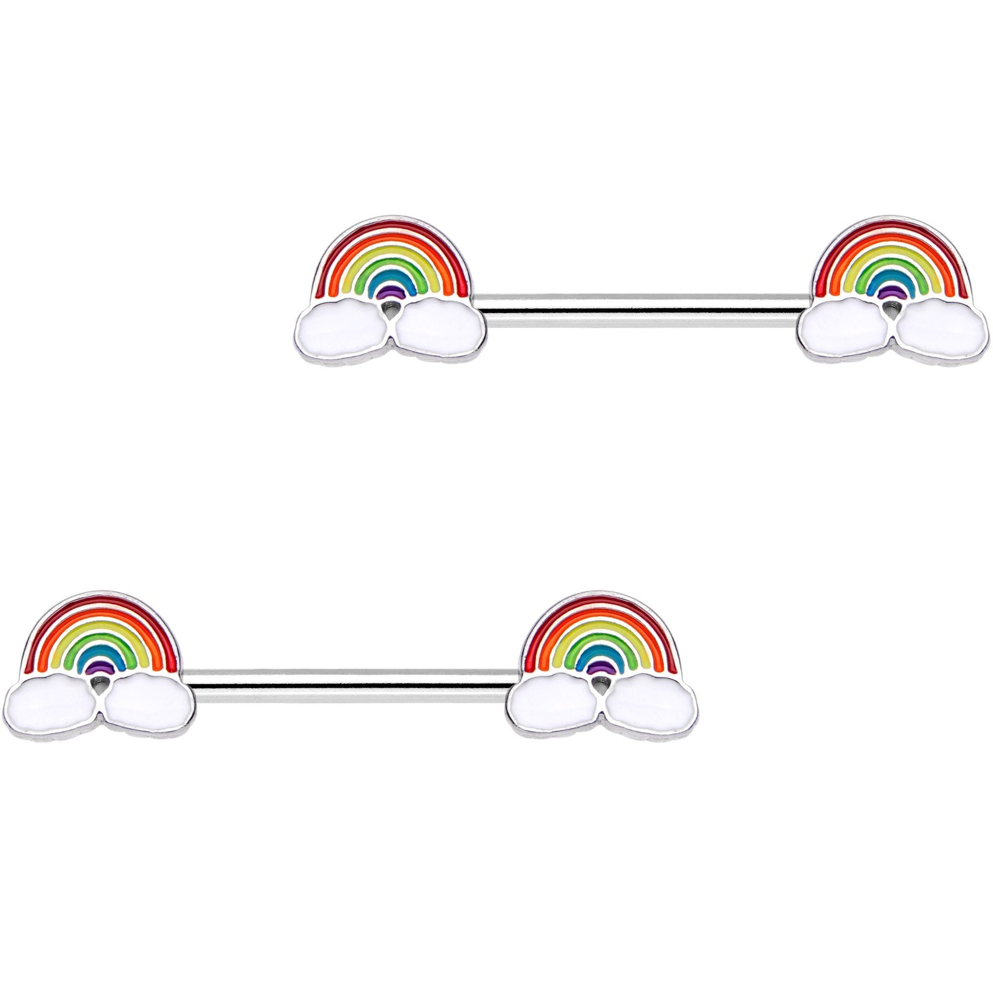 If you're always looking for the rainbow after the rain then you will love this pretty 14 gauge pair of nipple barbells. Made with 14mm durable 316L surgical grade stainless steel straight barbells, this nipple jewelry set features full color rainbow and cloud charm ends that will remind you that a couple of clouds don't mean a rainy day! This pair of cloud nipple piercings is sold as a set of two for you.