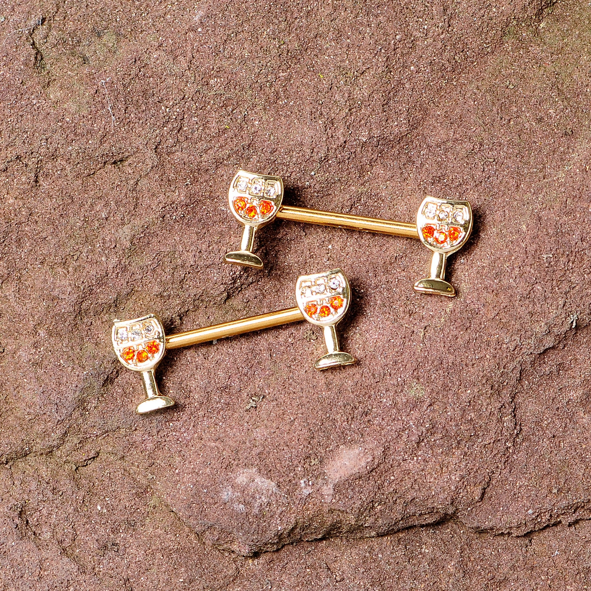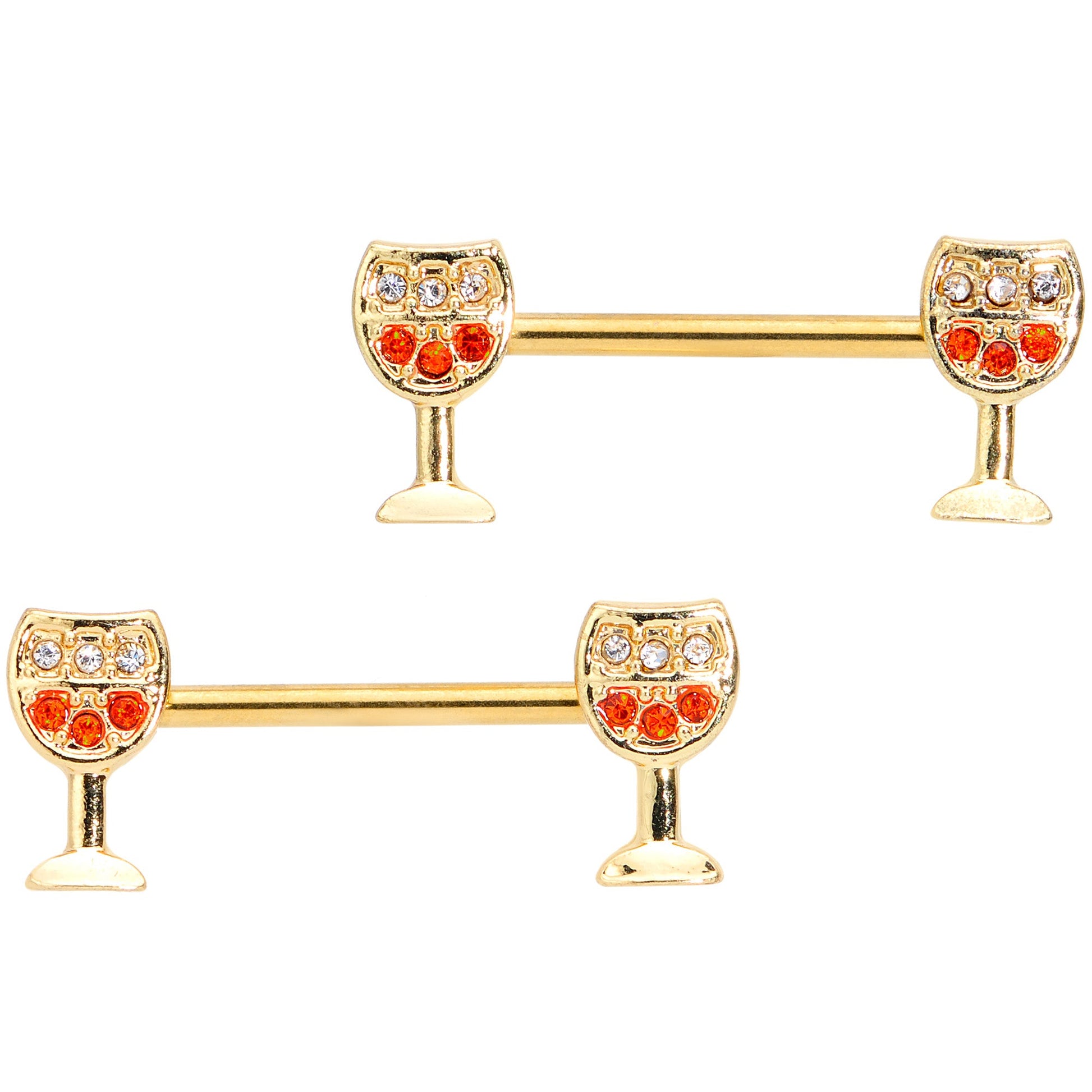 If you can't wait to celebrate the Christmas season, or any holiday including Thanksgiving, Halloween, New Year's Eve, and even Easter, then this festive 14 gauge nipple jewelry will be a favorite in your collection. Made with 14mm gold tone PVD over 316L surgical grade stainless steel straight barbells, these nipple piercings feature glass of wine charm ends set with clear and orange gems that look just like a celebratory drink! Sold as a set of two.Specifications