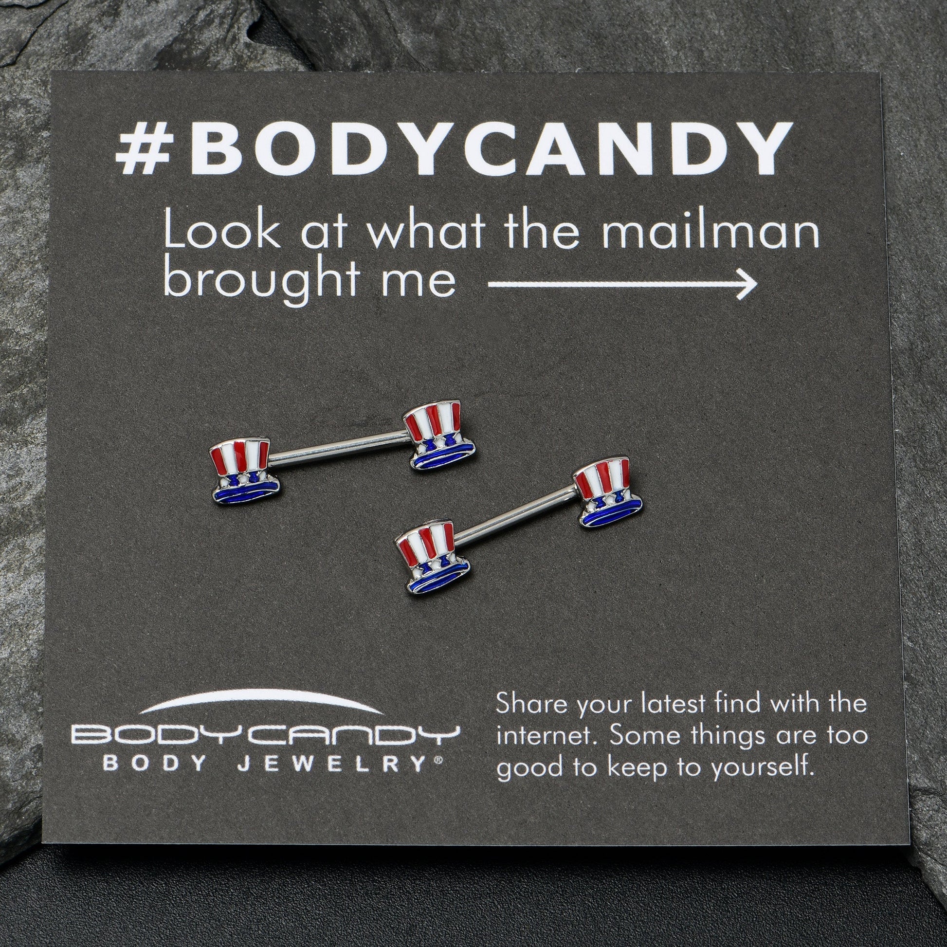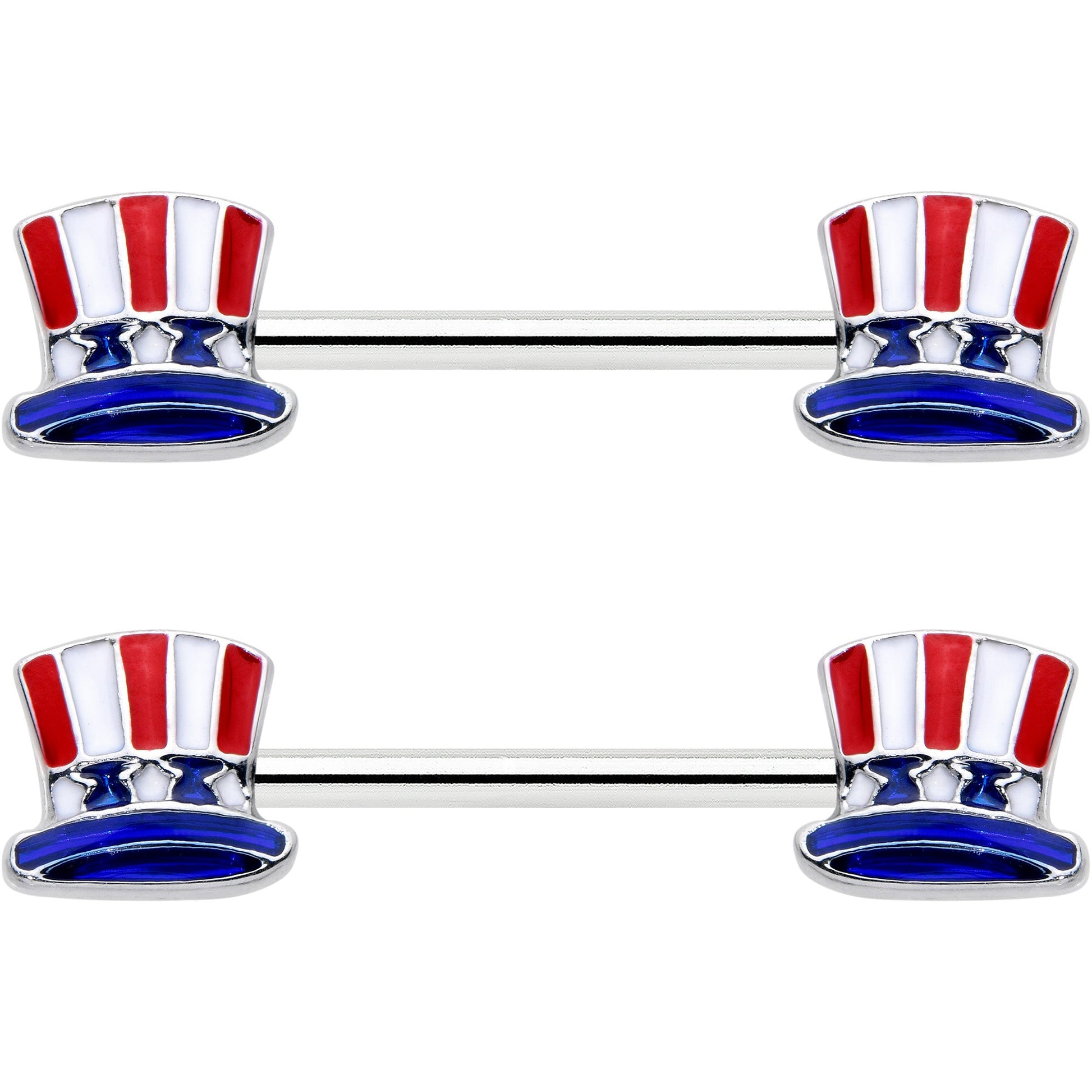 Uncle Sam is sure to covet this festive 14 gauge nipple jewelry. It is made with 14mm durable 316L surgical grade stainless steel straight barbells. Each of the ends features a top hat charm, in patriotic red, white, and blue. Get ready to rock this Independence Day in style with these perfectly patriotic nipple piercing rings. Sold as a set of two.Specifications
