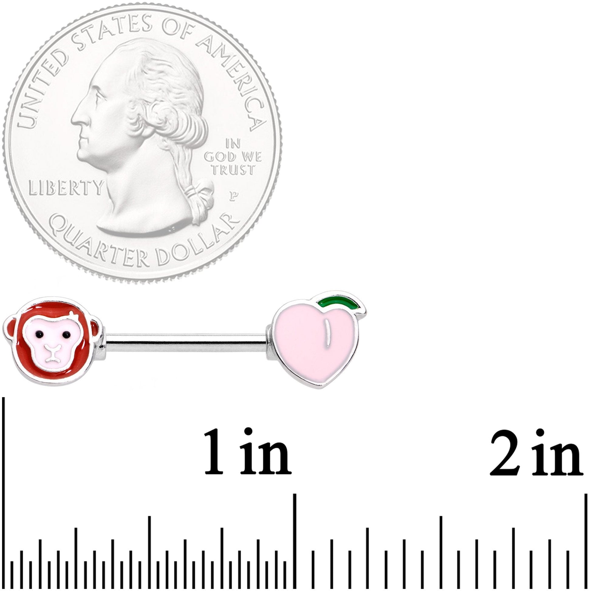 Mmmmm.......so sweet and juicy! And an equally sweet little friend! These 14 gauge nipple piercings are made with 14mm durable 316L surgical grade stainless steel straight barbells. One end features a ripe pink peach with fresh green in the leaves and silver-tone crack details that make the whole thing feel extra realistic. The other end is a little monkey's face, inlaid in brown and peach with a charming wide-eyed expression. Whether you have a fondness for the flesh of the fresh fuzzy fruit or just like to monkey around, these nipple barbells are bound to get your juices flowing! Sold as a set of two.Specifications