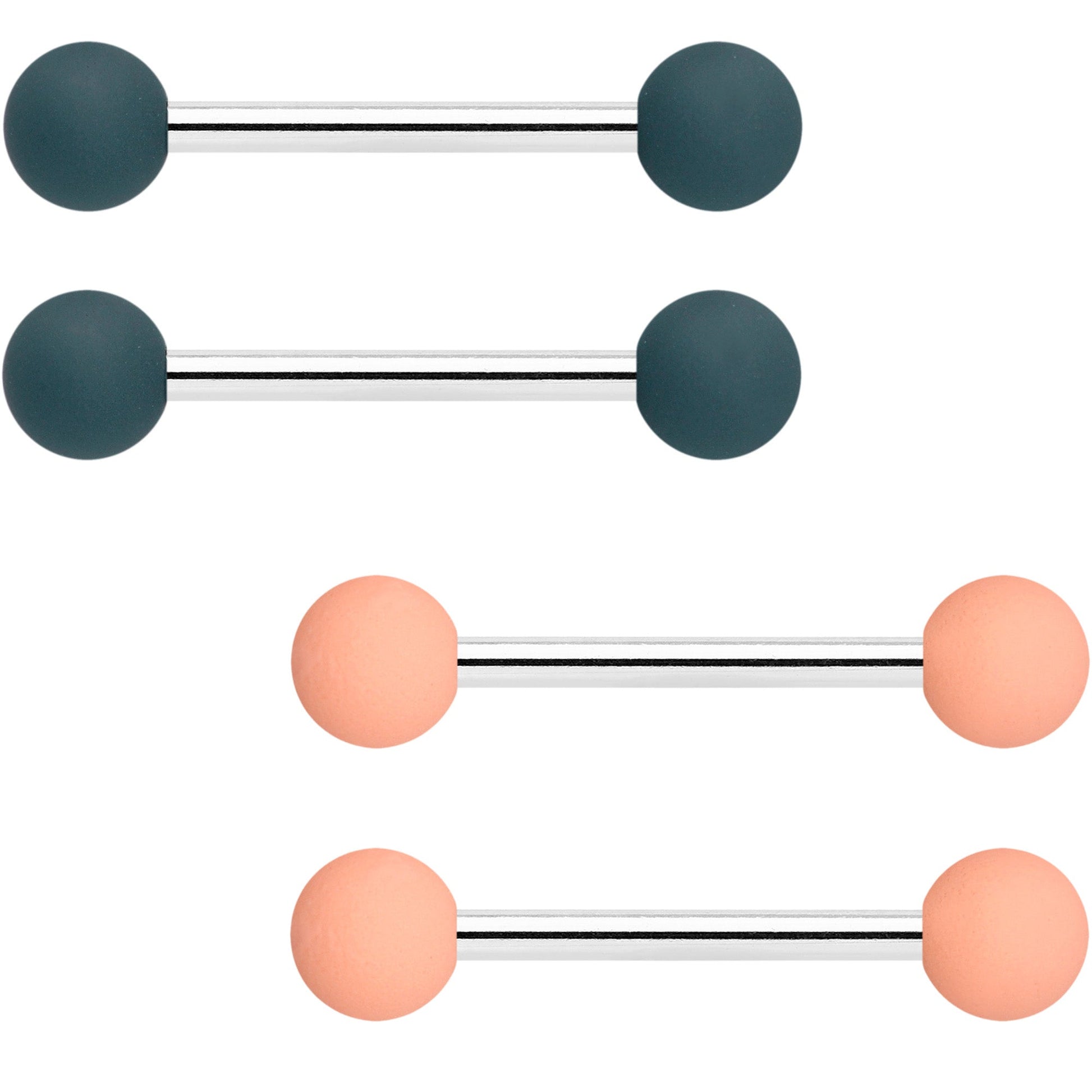 Simple style and elegantly unobtrusive color both combine to make comfortable and dainty nipple jewelry with these 14 gauge nipple rings! They're made with 14mm durable 316L surgical grade stainless steel straight barbells with 5mm ball ends. One pair has dark grey ends while the other pair is sweet peach and both have a subtly soft, matte finish to them. Keep it simple while still keeping it stylish with these peachy-keen nipple rings! Sold as a set of four.Specifications