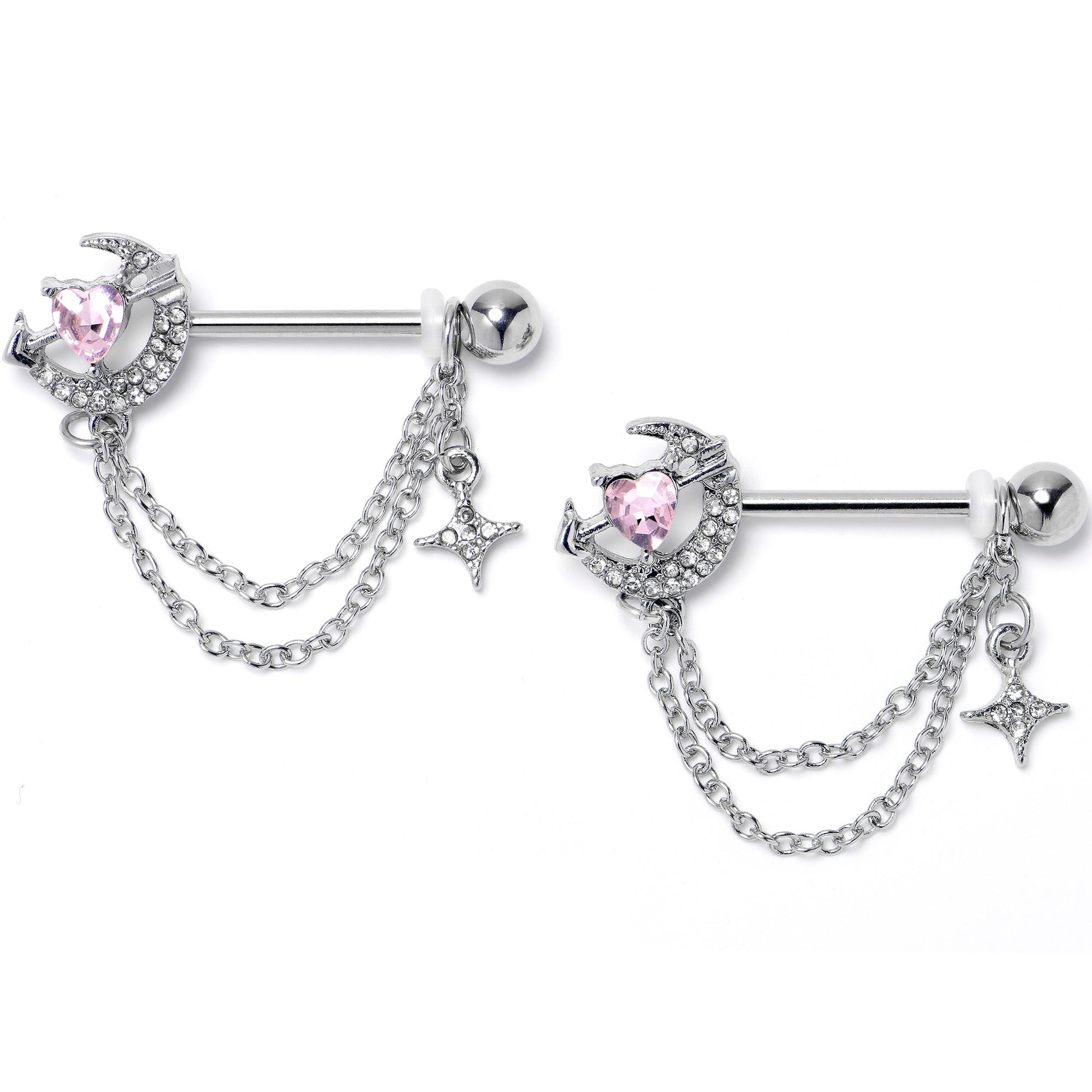Fall in love with the night sky when you're rocking this 14 gauge nipple jewelry. It's made with 14mm durable 316L surgical grade stainless steel straight barbells with a single 5mm ball end. The other end features a crescent moon charm, paved with clear gems. Nestled in the curves of the moons are pink gem hearts, pierced with an arrow embellishment. There are double lengths of chain that dangle from the moon are tipped with star dangle charms which are also set with clear gems. These celestial nipple piercing rings will steal your heart. Sold as a set of two.Specifications
