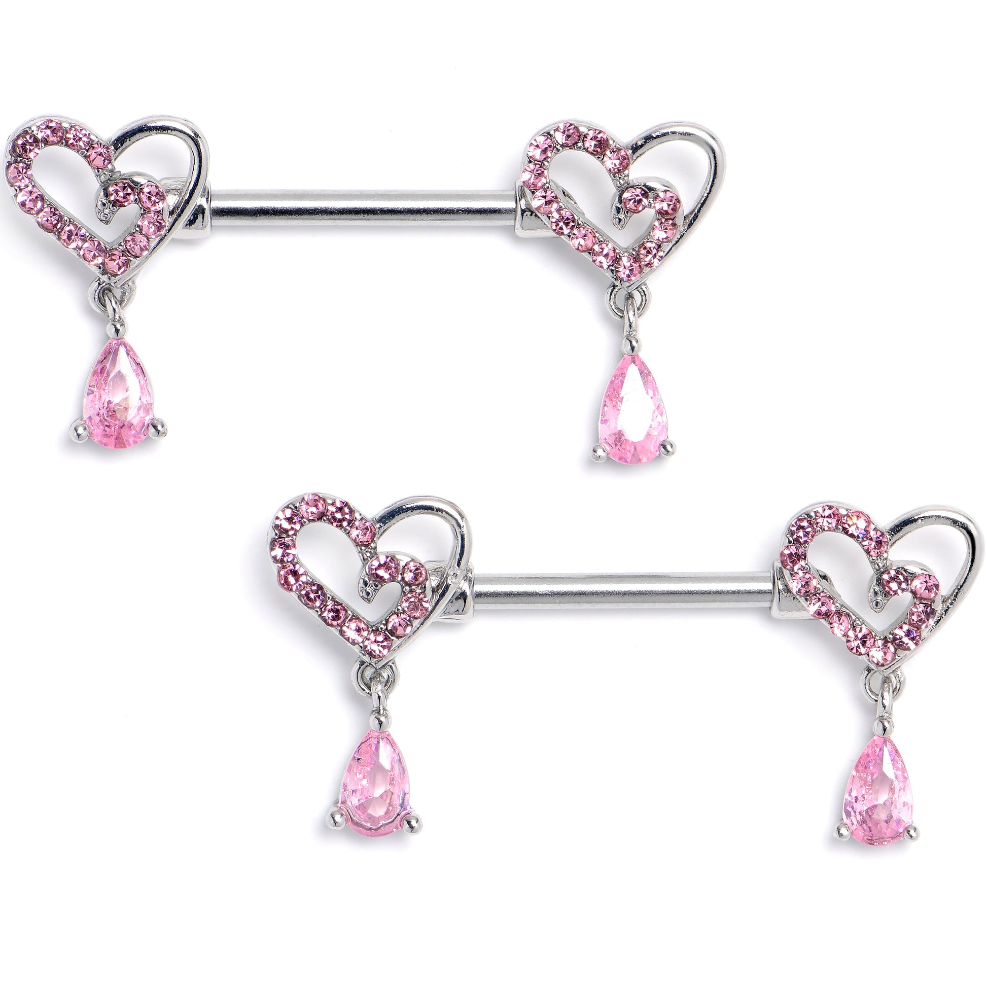 Keep style on your side when you fall in love with this 14 gauge nipple jewelry. It is made with 14mm durable 316L surgical grade stainless steel straight barbells. Each of the ends features a heart charm, with one side paved with pink cubic zirconia gems while the other side is unadorned for simple, asymmetrical style, and there is a pink cubic zirconia gem dangle for added motion. Get ready to love these opulent nipple piercing rings. Sold as a set of two.Specifications