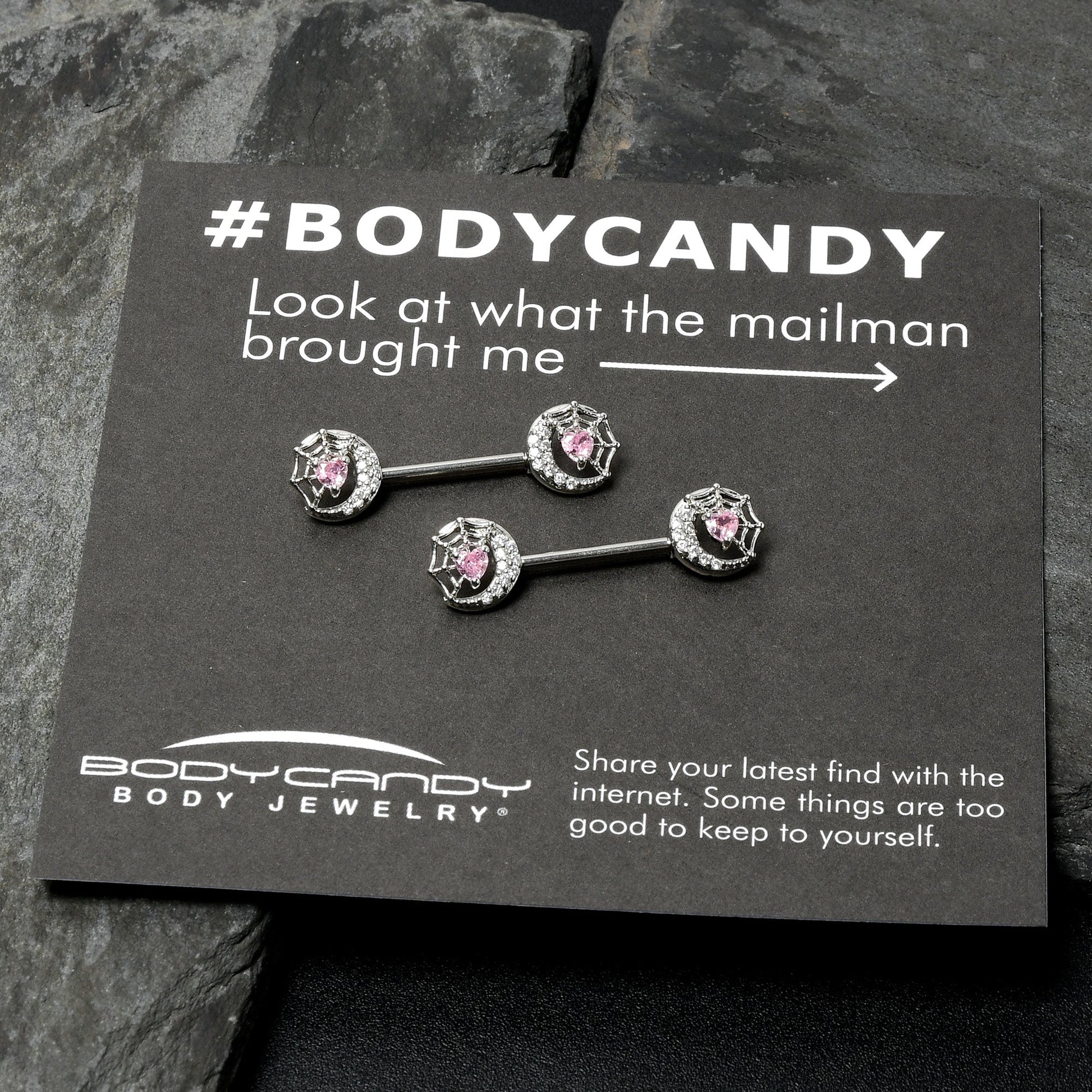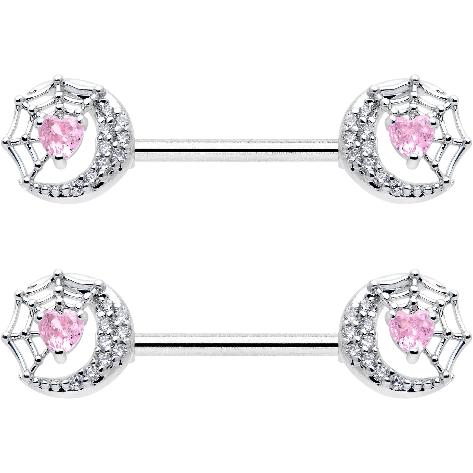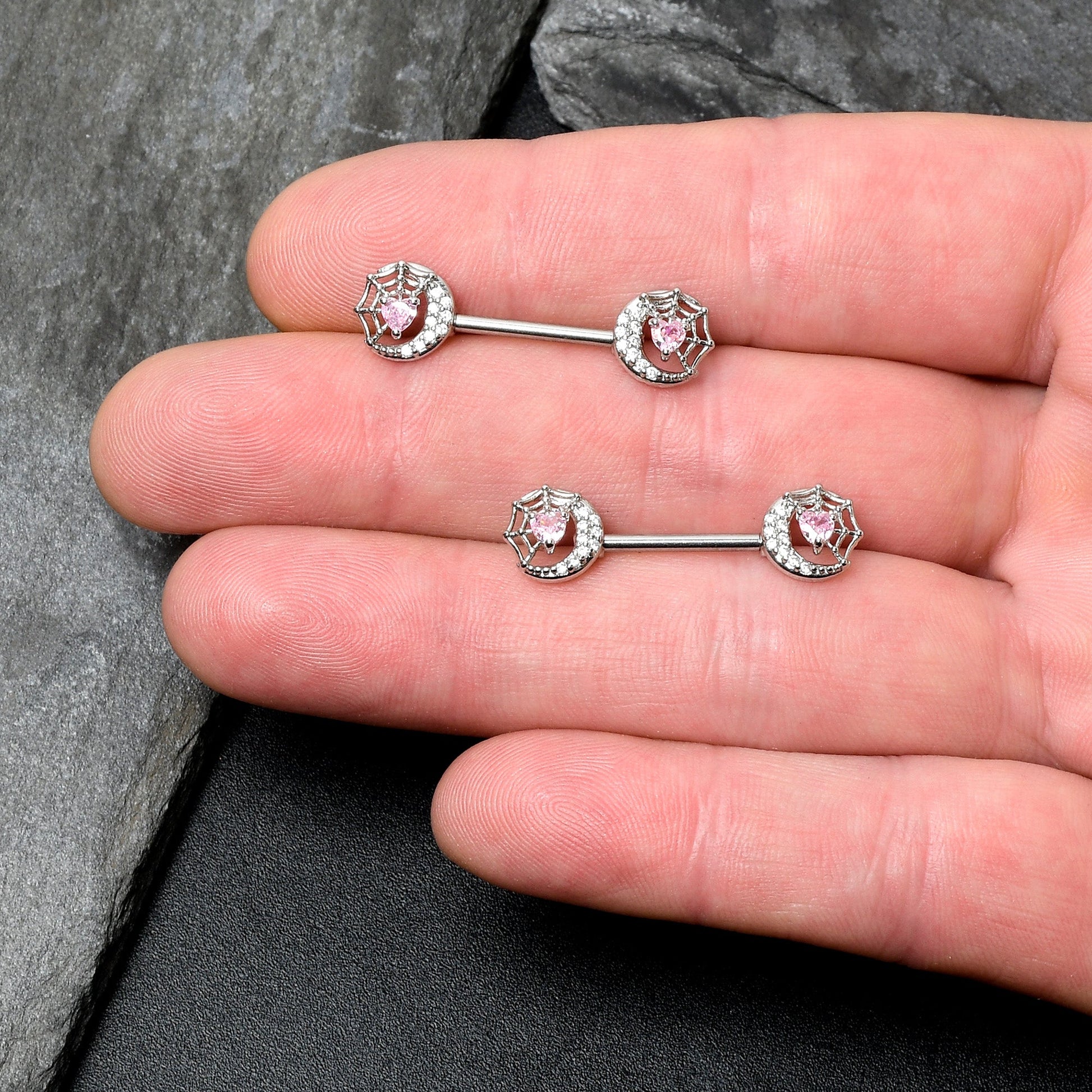 14 Gauge 9/16 Pink CZ Gem Heart Web Moon Barbell Nipple Ring Set