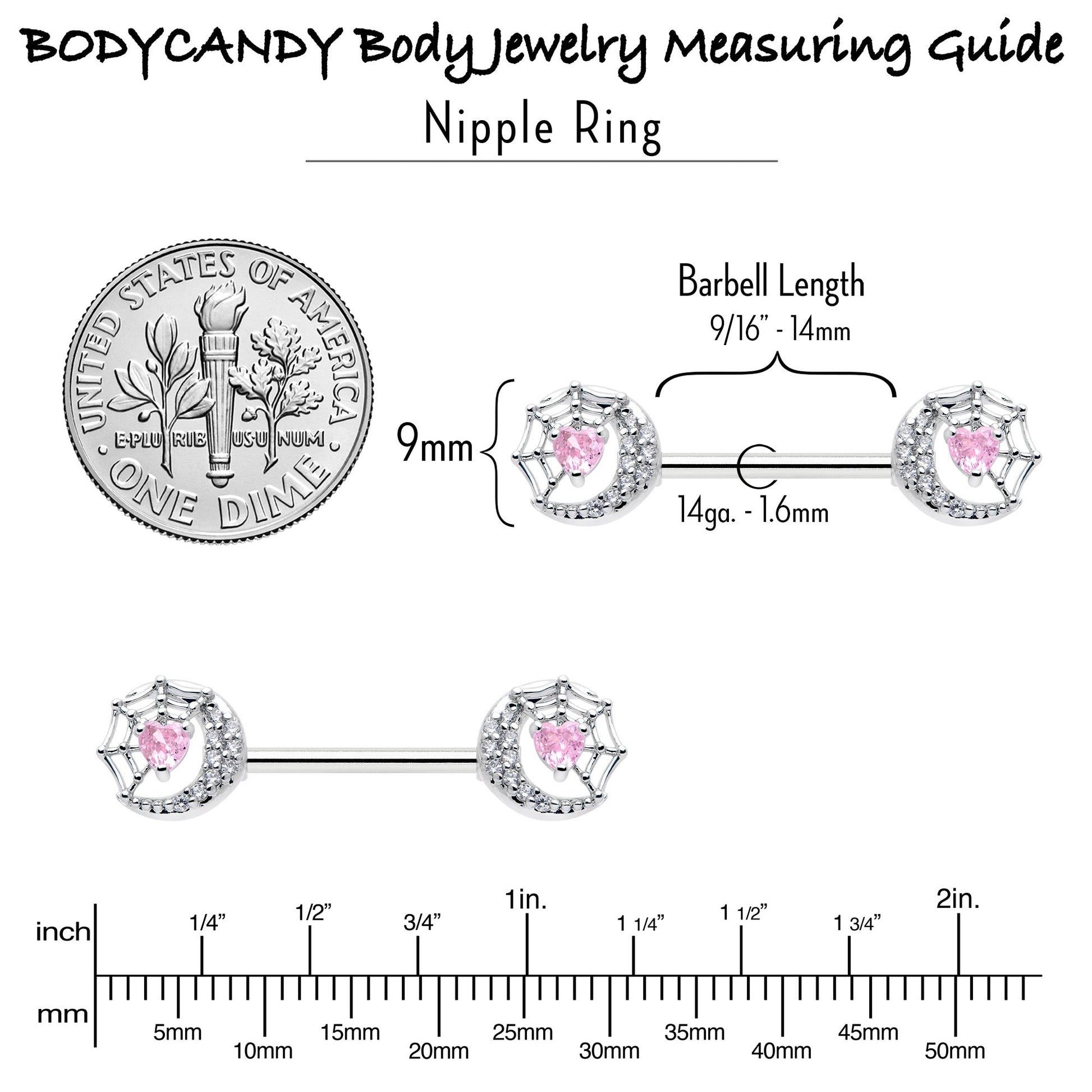 If you are a creature of the night, show it off with this 14 gauge nipple jewelry. It is made with 14mm durable 316L surgical grade stainless steel straight barbells. Each of the ends features a crescent moon charm, set with clear cubic zirconia gems. The ends of the moon are connected with a spiderweb detail, which is set in the center with a heart shaped pink cubic zirconia gem. For gothic glamour, these nipple piercing rings cannot be beat. Sold as a set of two.Specifications
