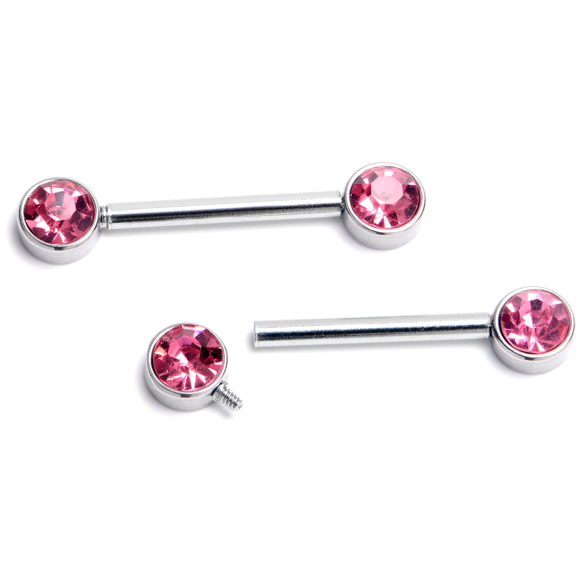 Simple style that goes with everything is what you get with with these 14 gauge nipple rings. They are made with 14mm durable 316L surgical grade stainless steel straight barbells. The ends are set with forward facing pink cubic zirconia gems for a touch of color and style. They feature an internally threaded design for maximum comfort on insertion and removal, Keep it simple while still keeping it stylish with these eternally elegant nipple rings. Sold as a set of two.Specifications