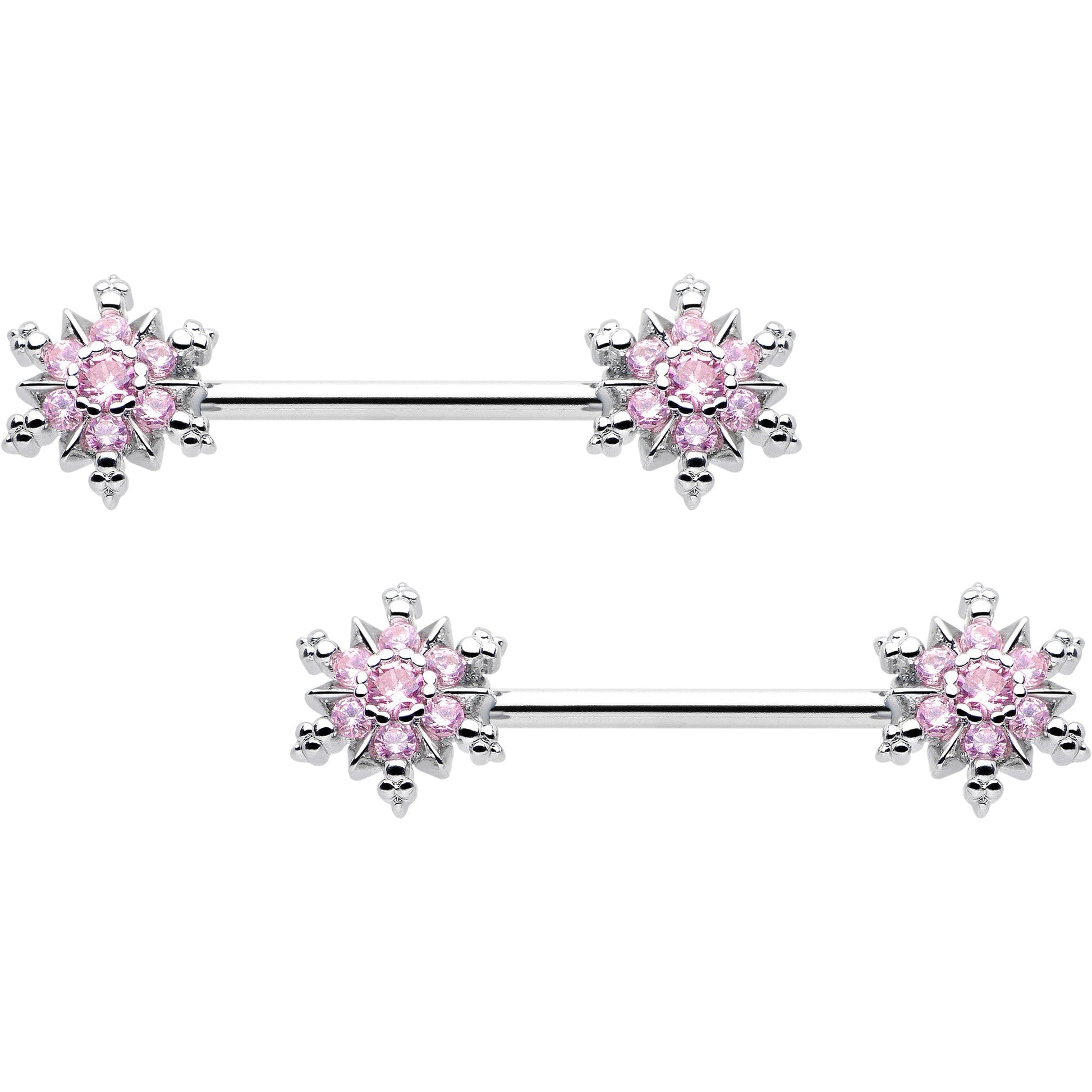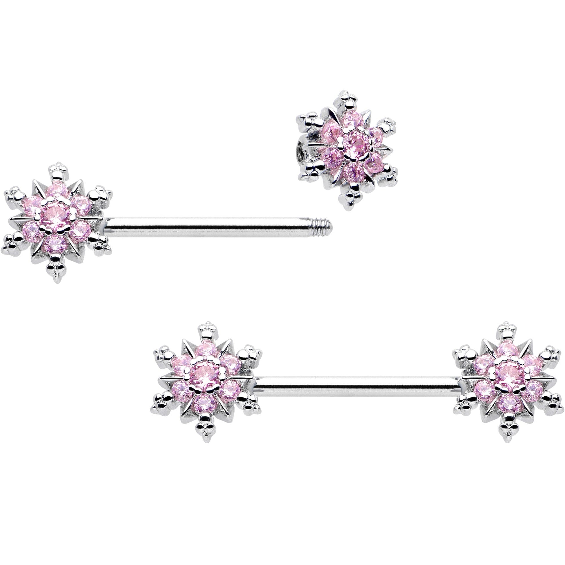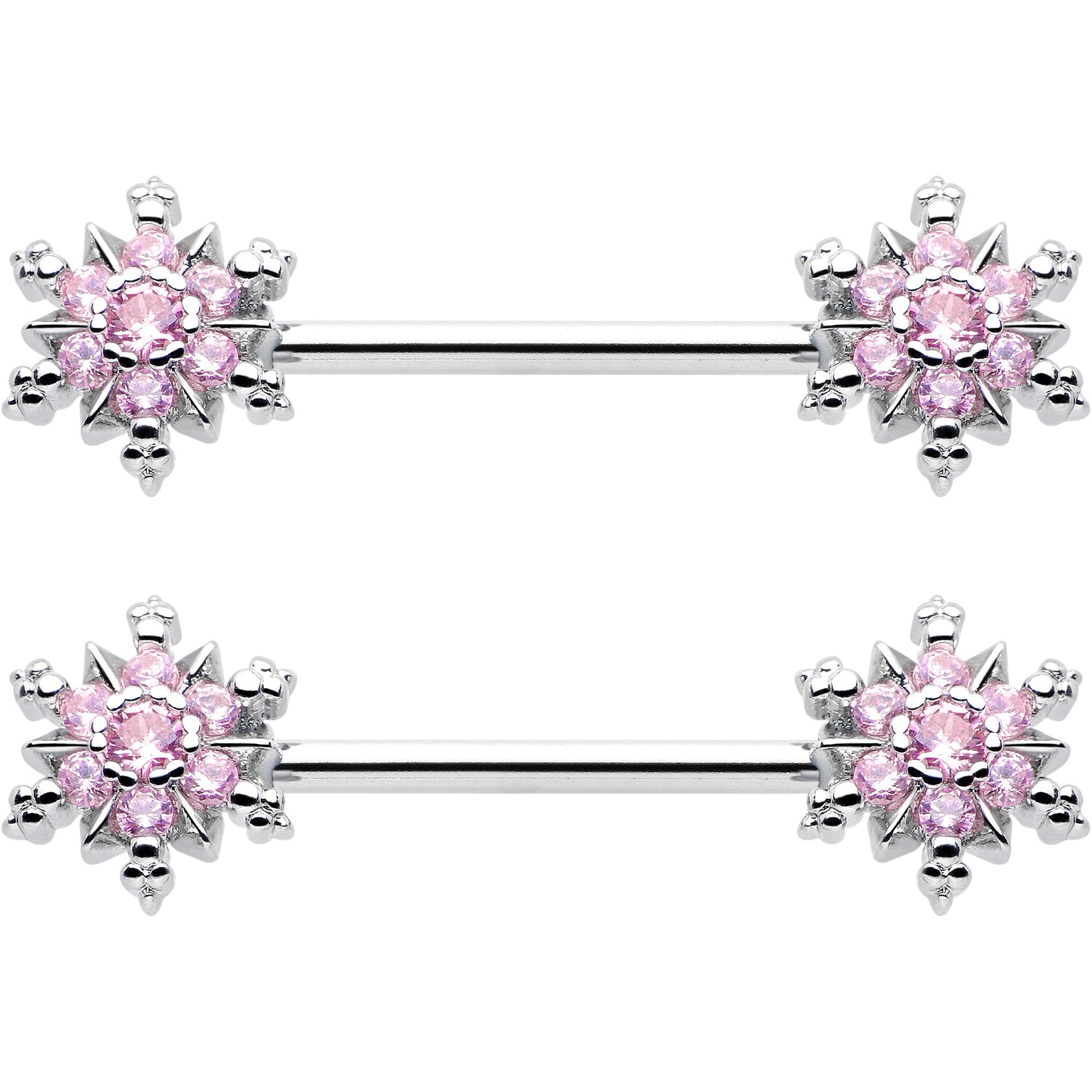 14G 9/16 Pink CZ Gem Snowflake Glam Barbell Nipple Ring Set