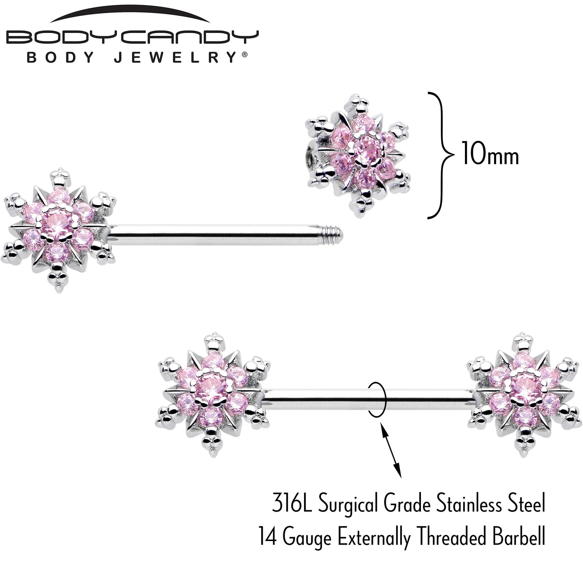 This winter, get fashionable and funky with the glamorous snowflakes on this 14 gauge nipple jewelry. It's made with 14mm durable 316L surgical grade stainless steel straight barbells. Each of the ends features a heavily ornamented snowflake charm, with pink cubic zirconia gem embellishments and textured detailing. You'll have glamour to spare all winter long with these stylish snowflake nipple piercing rings. Sold as a set of two.Specifications