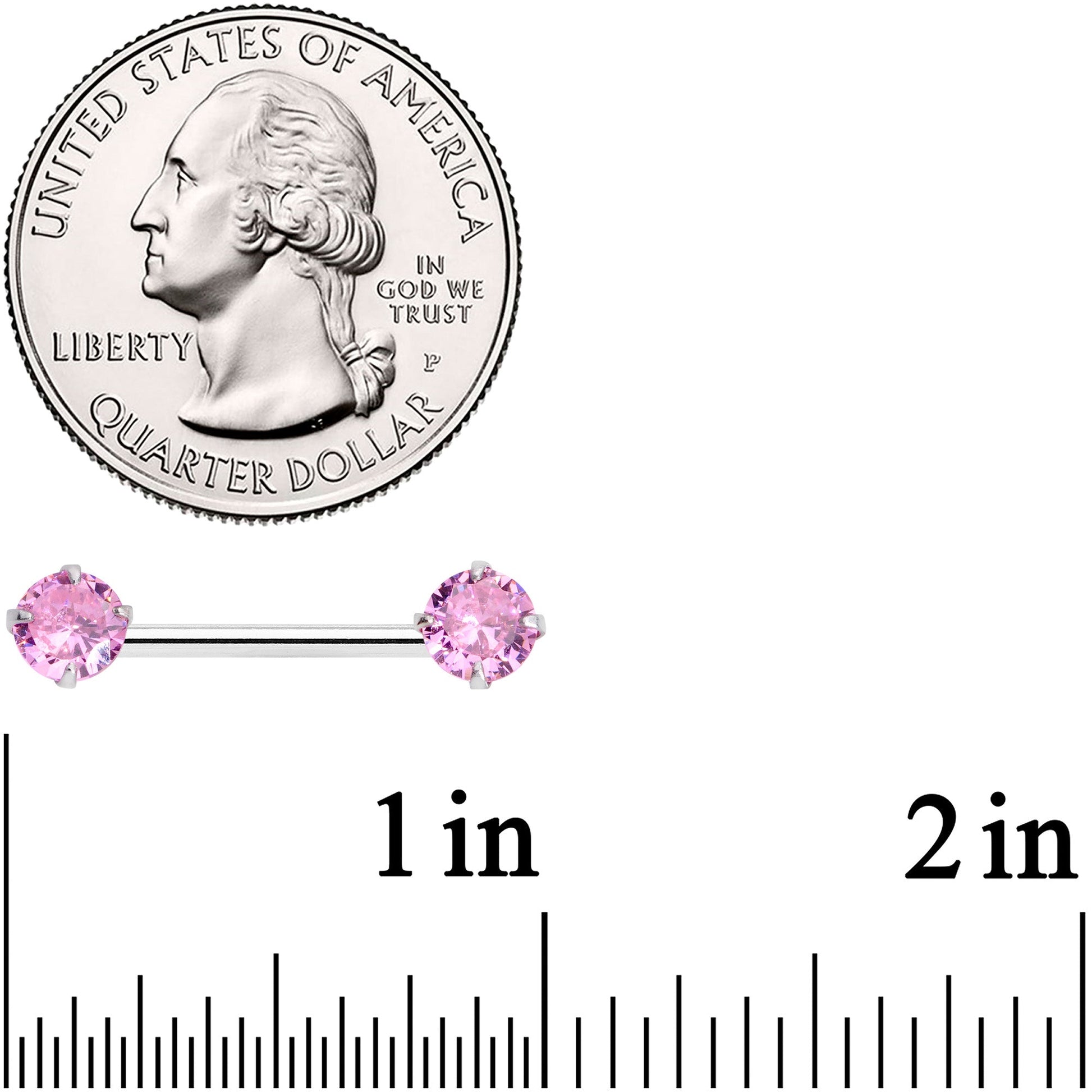 Add some sexy sophistication to your nipple piercings with this 14 gauge nipple jewelry! It's made with 14mm durable 316L surgical grade stainless steel straight barbells. The charm ends are threadless round pink cubic zirconia gems made to make insertion and removal a breeze while still offering a secure fit. With their easy elegance and uncomplicated sophistication, these nipple piercing rings really do have it all! Sold as a set of two.Specifications
