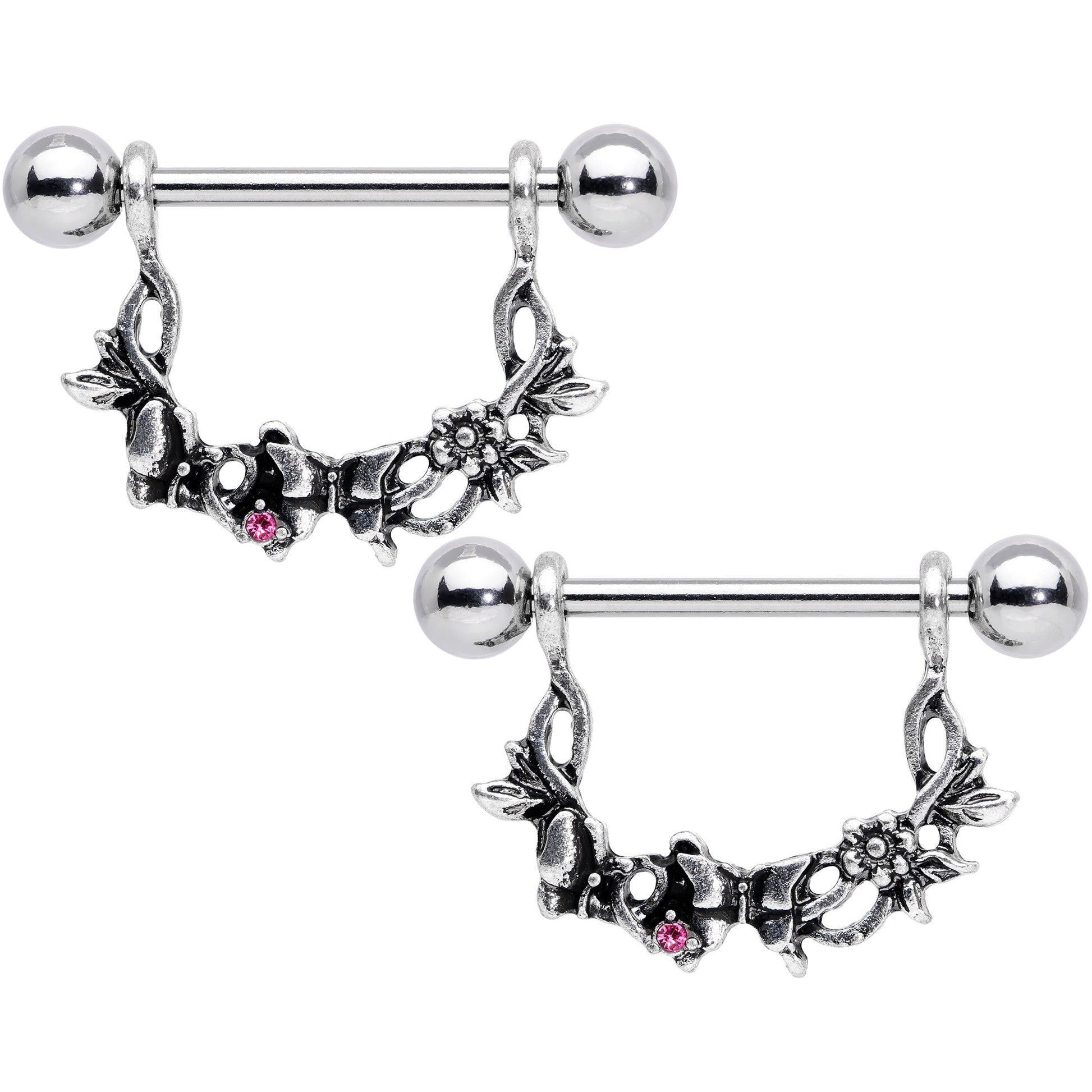 14G 9/16 Pink Gem Abstract Bow Butterfly Dangle Nipple Ring Set