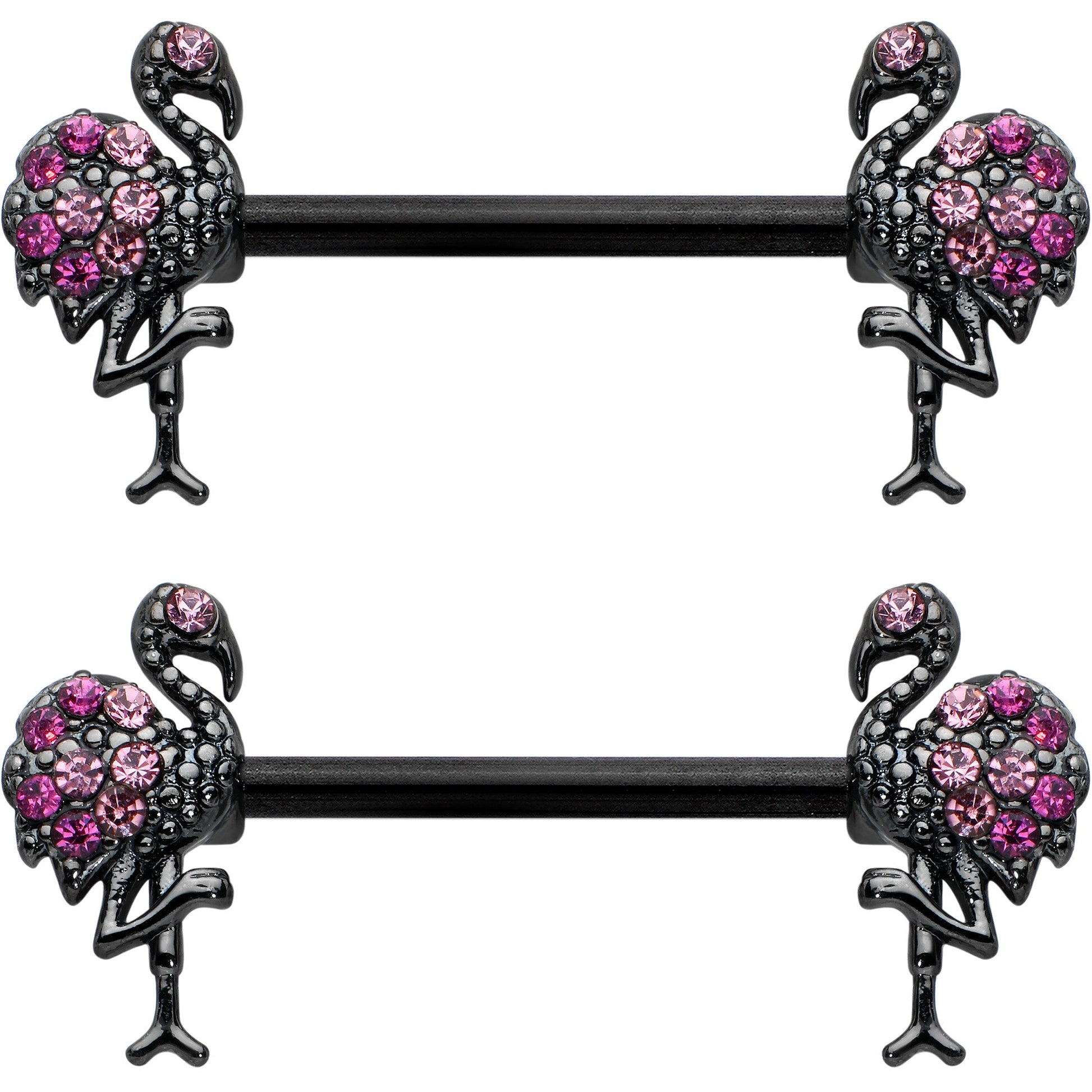 The flamingos on this 14 gauge nipple jewelry have style to spare! It's made with 14mm black PVD over 316L surgical grade stainless steel straight barbells. Each of the ends features a flamingo charm standing in its iconic one-legged pose. They're set with hot pink gems and further embellished with lighter pink gems for contrast. Let these bold birds lend their style to your nipple piercings with these fantastic flamingo nipple rings! Sold as a set of two.Specifications