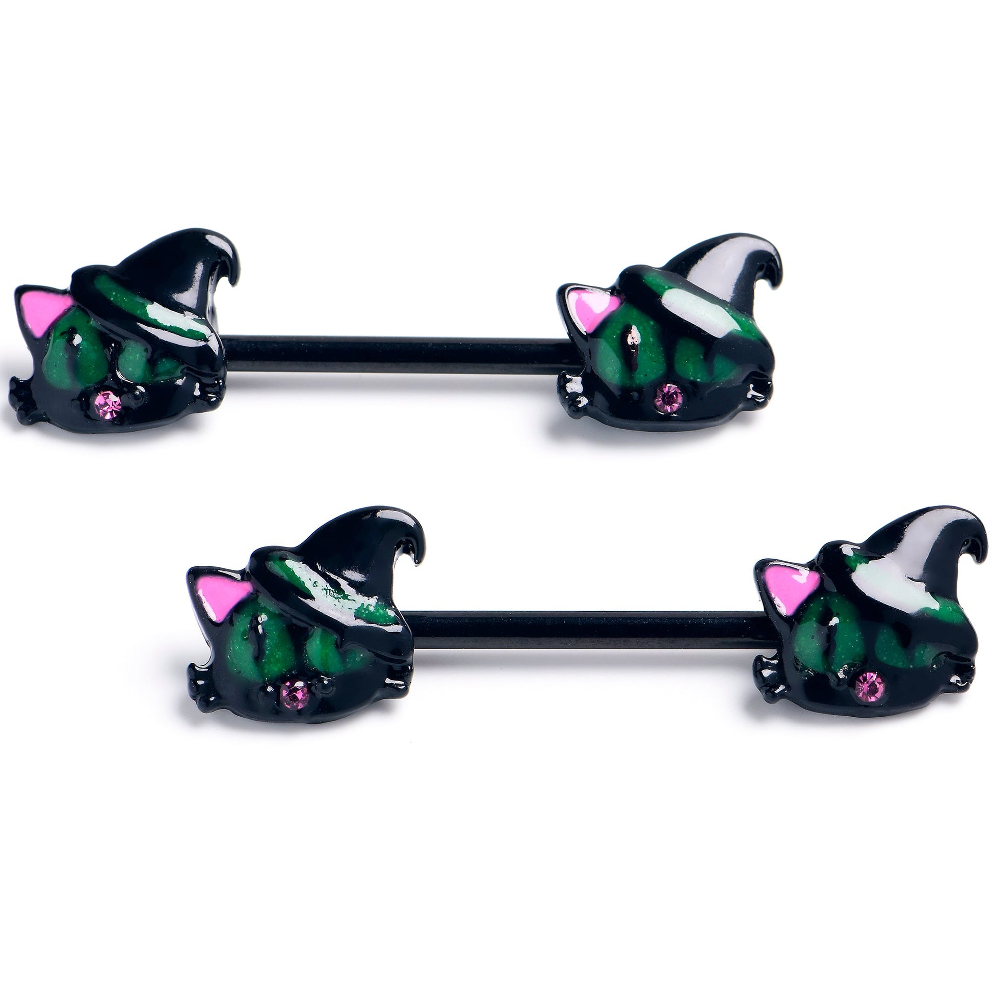 All cats are beautiful but the ones on this 14 gauge nipple jewelry have style to spare. It is made with 14mm black PVD over 316L surgical grade stainless steel straight barbells. Each of the ends feature a black cat with large green eyes and a pink gem noses. The cats are wearing black witches hats with a green bands for a cohesive appearance. These feline friends will have you looking gorgeous with these Halloween themed nipple piercing rings. Sold as a set of two.Specifications