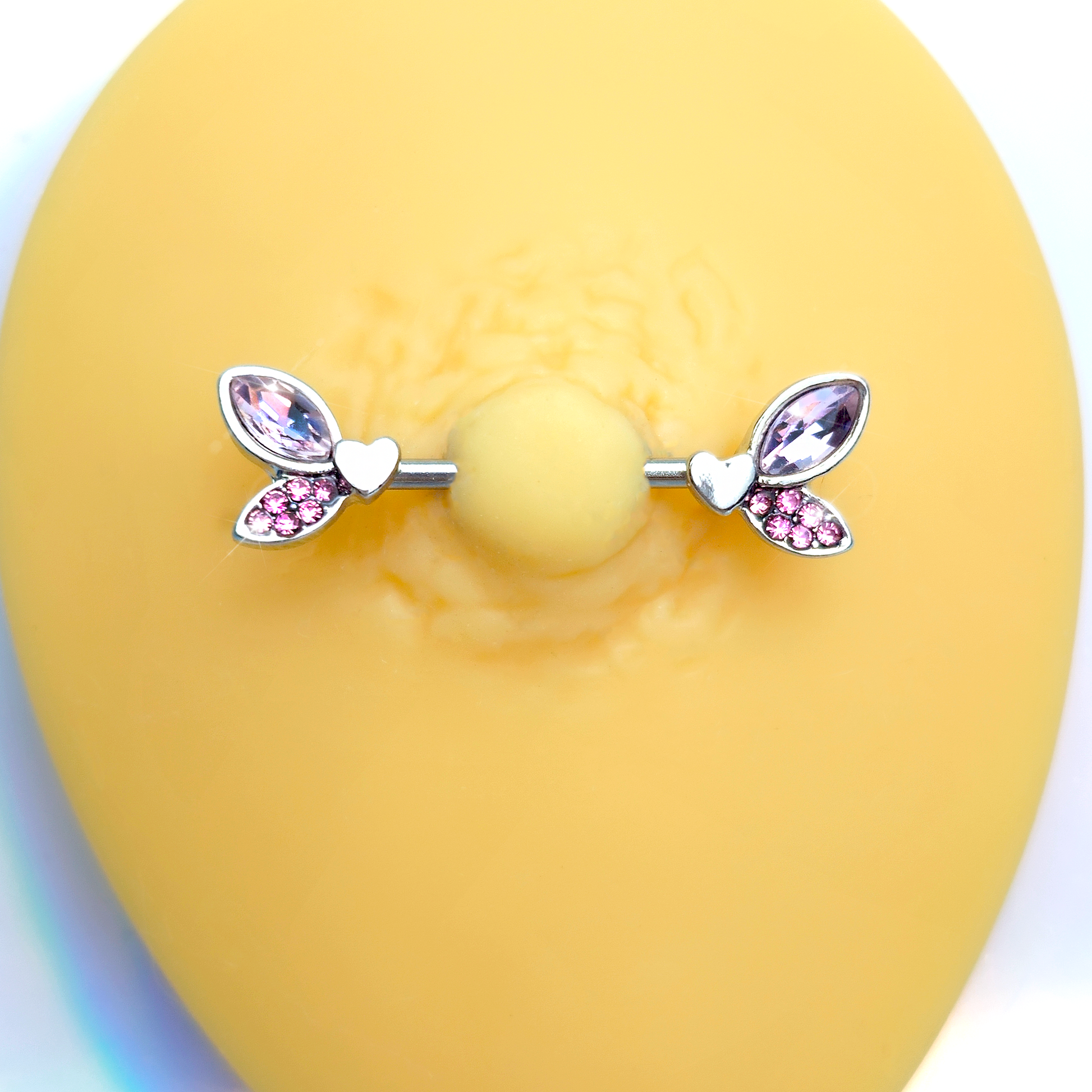 Bedeck your nipple piercings with the beautiful butterflies on this 14 gauge nipple jewelry. It is made with 14mm durable 316L surgical grade stainless steel straight barbells. Each of the ends feature elegant butterfly charms with one wing composed of a single pink gem and the other paved with small pink gems. They also feature a heart embellishment at their centers. Let these bodacious butterflies pack a powerful punch of polish to your look with these loving butterfly nipple piercing rings. Sold as a set of two.Specifications