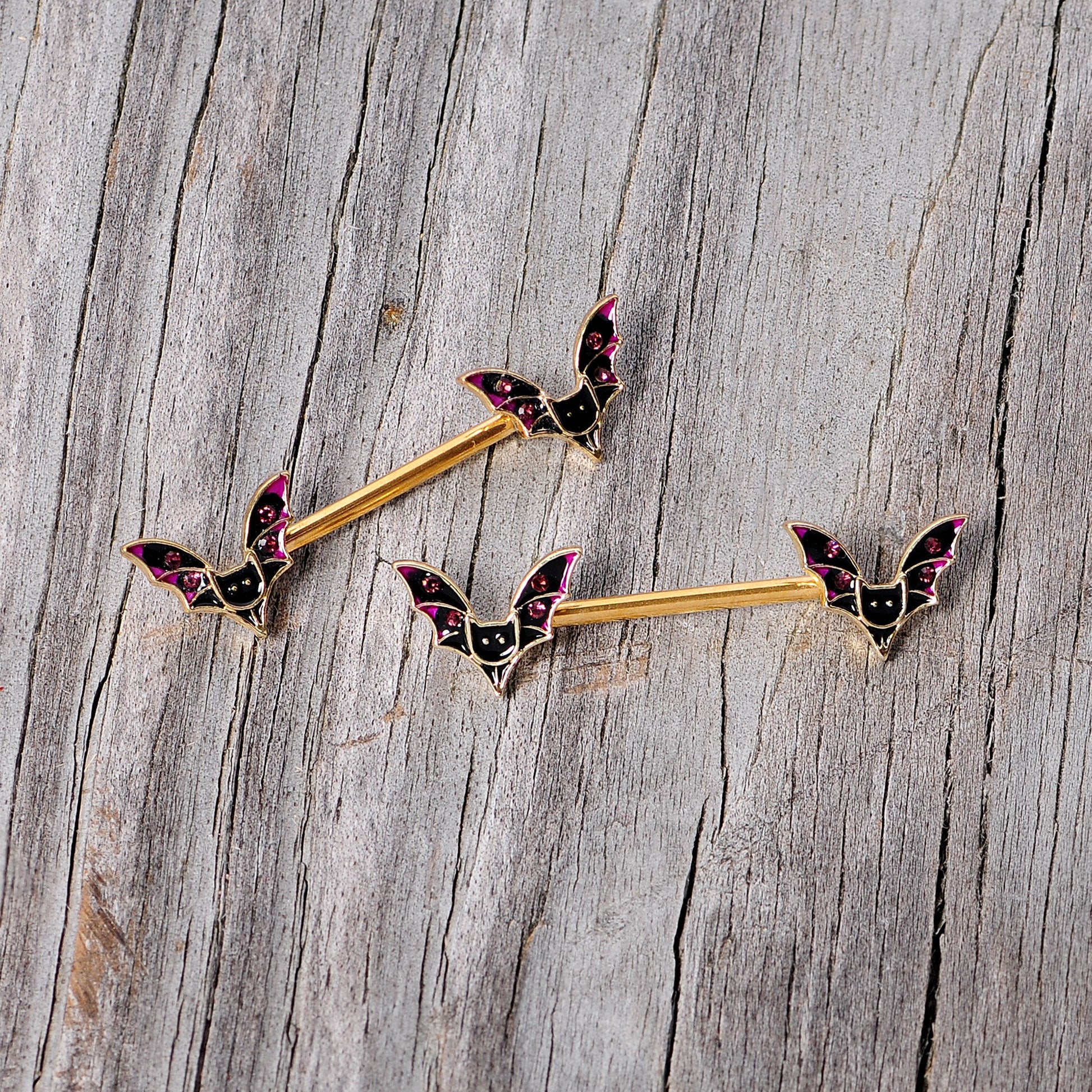 If you are a regular scream queen then get ready for Halloween this year with the perfect pair of 14 gauge nipple piercings. Made with 14mm gold tone PVD over 316L surgical grade stainless steel straight barbells, this nipple jewelry features vampire bat charm ends set with pink gems. Sold as a set of two.Specifications