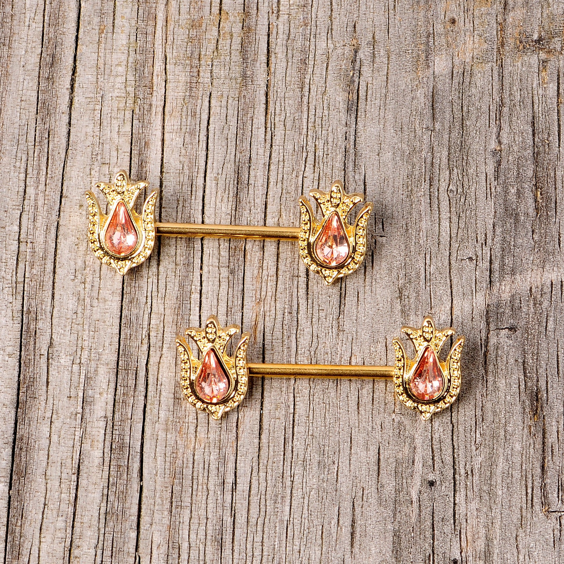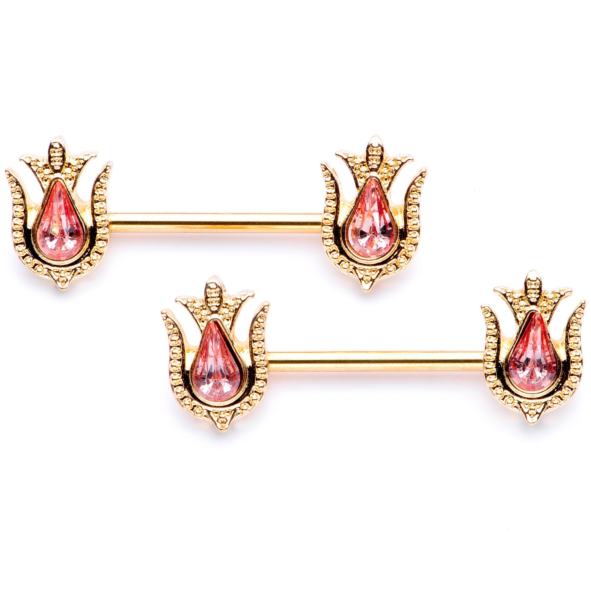 Carry a little piece of springtime with you all year long with this floral 14 gauge nipple jewelry! It's made with 14mm gold tone plated over 316L surgical grade stainless steel straight barbells. Each end features a tulip-inspired floral charm with textured detailing along the edges and a pink gem at its center. The combination of sweet pastel color and rich gold tone hardware makes for a look of eye-catching elegance. Your look is bound to blossom with these tempting tulip nipple rings! Sold as a set of two.Specifications