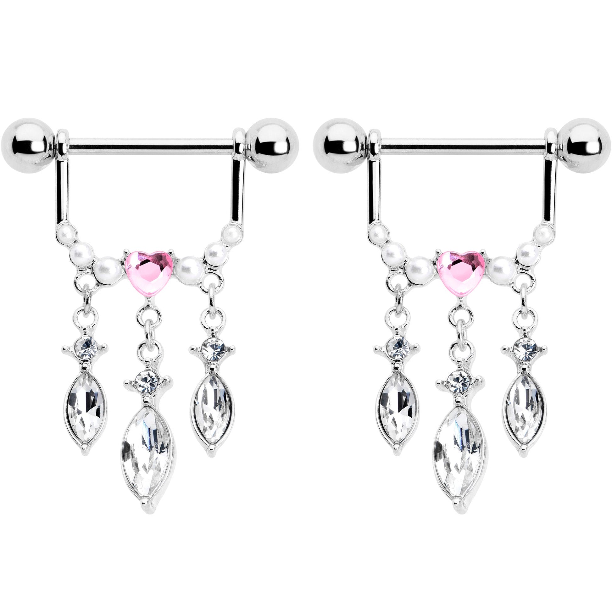 Triple the impact with this super luxe 14 gauge nipple jewelry. It's made with 14mm durable 316L surgical grade stainless steel straight barbells with 5mm ball ends. Each one supports a row of of faux pearls with a pink gem heart in the center. Hanging beneath is a triple row of drop-shaped clear gem dangles. Turn up the volume on style with these ultra opulent nipple piercing rings. Sold as a set of two.Specifications