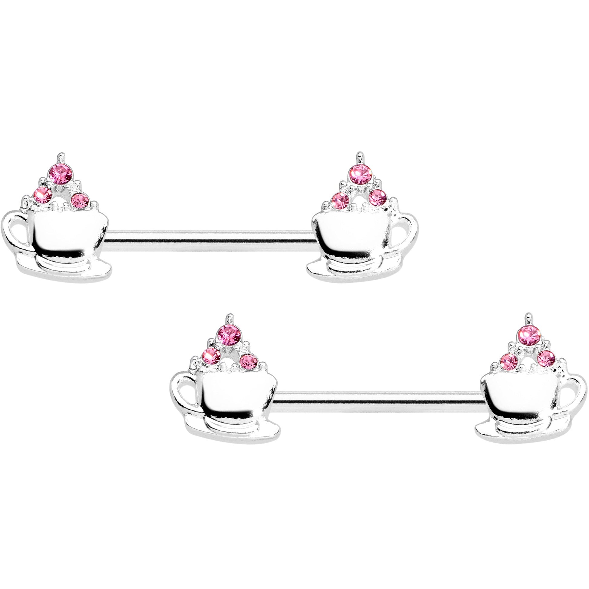 Mmmm......what could be sweeter than a cup of cocoa on a cold day? The sweet cups of cocoa on this 14 gauge nipple jewelry! It's made with 14mm durable 316L surgical grade stainless steel straight barbells with ends that feature matching teacup charms sitting on their own little saucers. Each one appears to be filled to the brim and features small pink gems taking the place of marshmallows floating on the top. These cups of cocoa are sure to make your nipple piercings look absolutely delicious, all year round! Sold as a set of two.Specifications