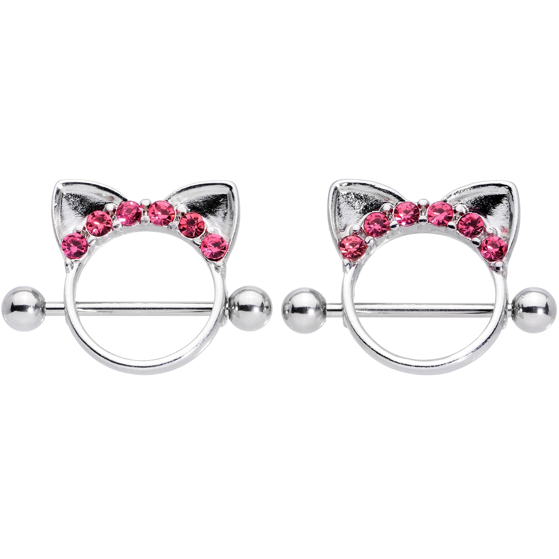 Here's a pair of kitties to make your nipple piercings pretty, on these 14 gauge nipple shields! They're made with 14mm wearable length 316L surgical grade stainless steel straight barbells with 5mm ball ends. The barbells have a total length of 3/4". The shield portion features a fashion-forward feline theme, with cat ears on the top. The ears are embellished with a row of pink gems for an added touch of glamour that every cool cat and kitten can appreciate! Give your nipple piercings the purr-fect look with this fabulous feline nipple jewelry! Sold as a set of two.Specifications