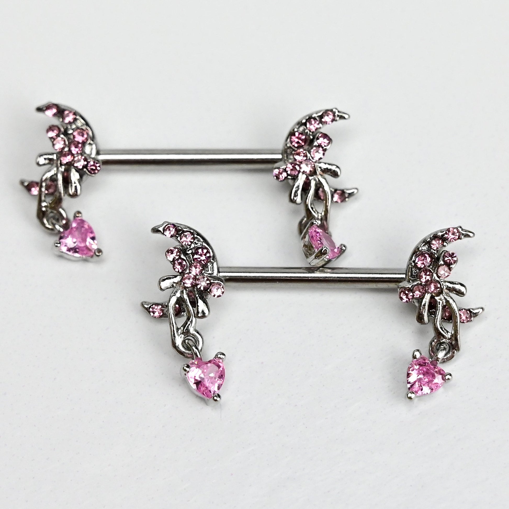 14G 9/16 Pink Gem Moon Bow Heart Dangle Nipple Ring Set