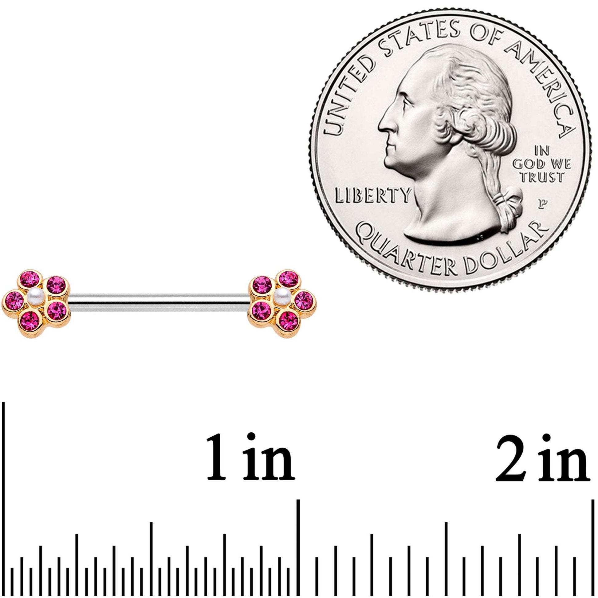 Flowers are nice and so are gems, but both together is the best of all! These nipple barbells are 14 gauge and made with durable 316L surgical grade stainless steel straight barbells. They are tipped with gold tone flowers, made of rich feminine pink gems and capped with a luscious white orb in the center. At 14mm they are the perfect size for you to wear flowers on you every place you go! Sold as a set of two.Specifications