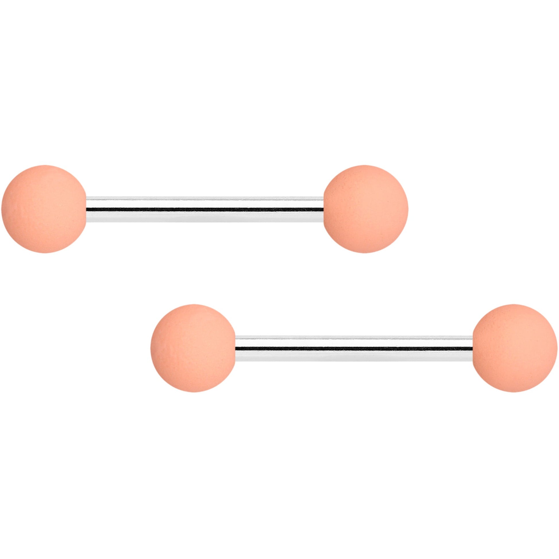 Simple style and soft, sweet color both combine to make comfortable and dainty nipple jewelry with these 14 gauge nipple rings! They're made with 14mm durable 316L surgical grade stainless steel straight barbells with 5mm ball ends. One pair has pale pink ends while the other pair is sweet peach, and both have a subtly soft, matte finish to them. Keep it simple while still keeping it stylish with these sweet and sassy nipple rings! Sold as a set of four.Specifications