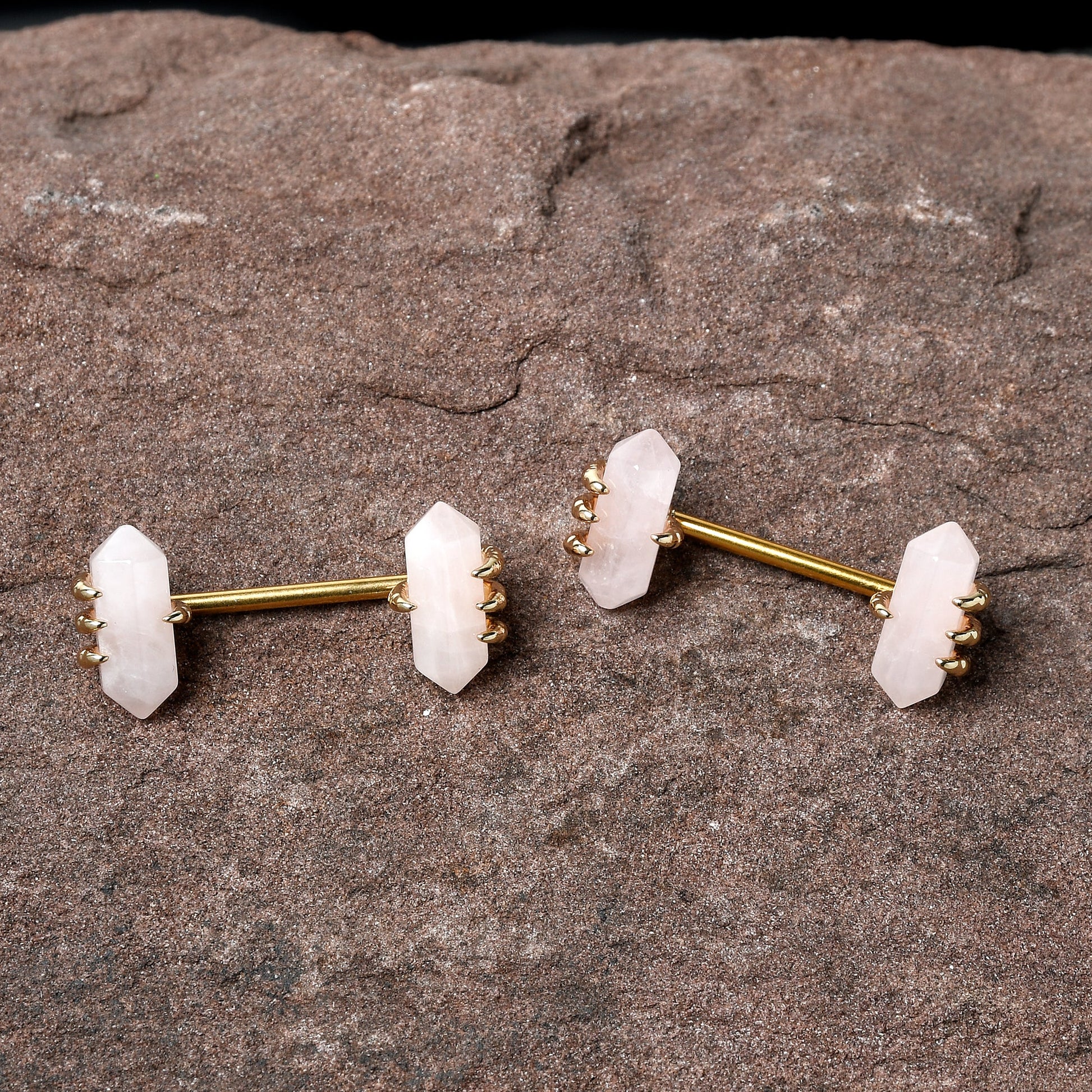 14G 9/16 Pink Rose Quartz Gold Tone Claw Barbell Nipple Ring Set