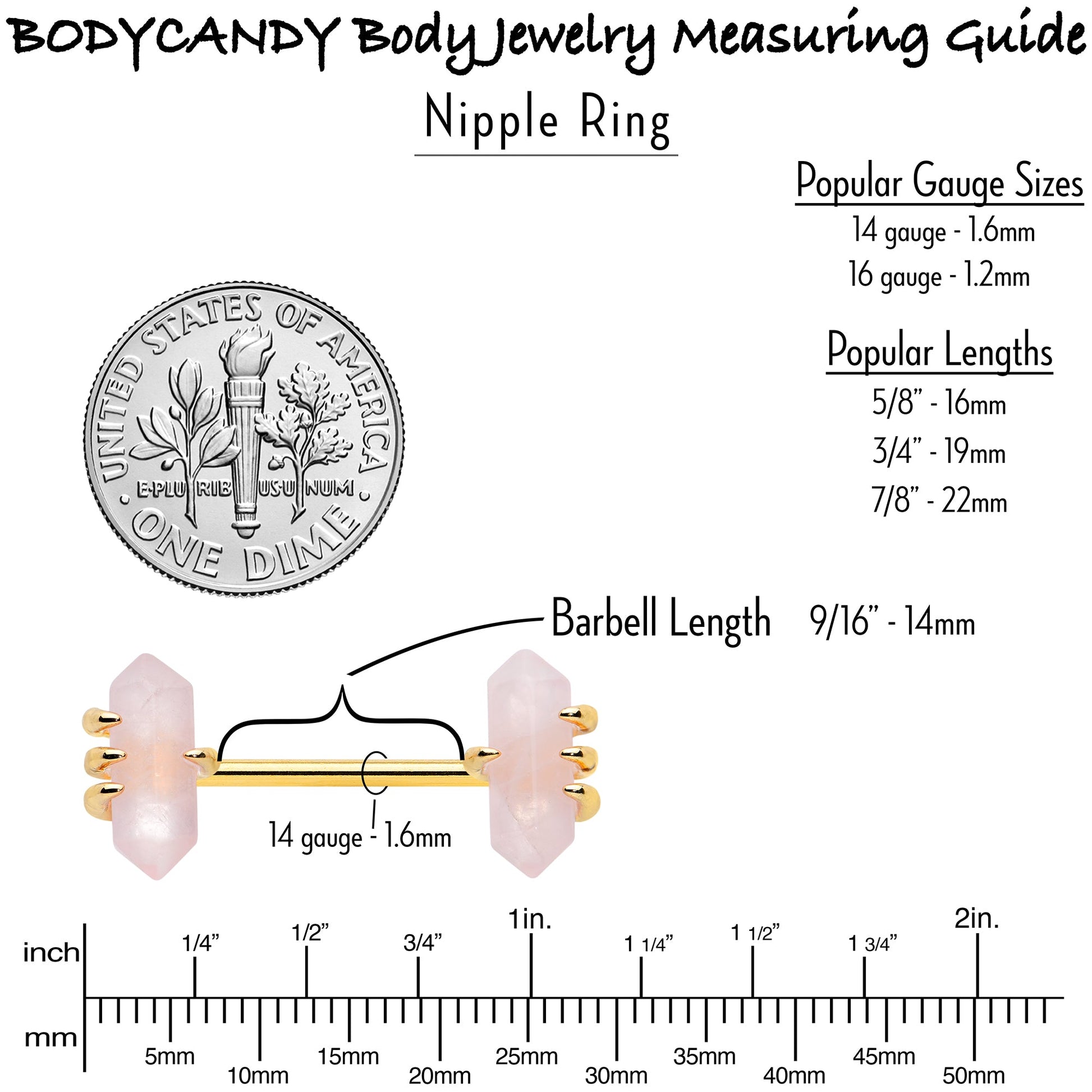 If you're into crystals and incense, this 14 gauge nipple jewelry is sure to give you a happier aura! It's made with a 14mm gold tone PVD over 316L surgical grade stainless steel straight barbells. Bound to each end of the barbell is a band is a pink rose quartz, with its classic obelisk shape held in a claw-style setting. While we can't claim they have any magical powers, they will certainly look magical in your nipple piercings! Sold as a set of two.Specifications