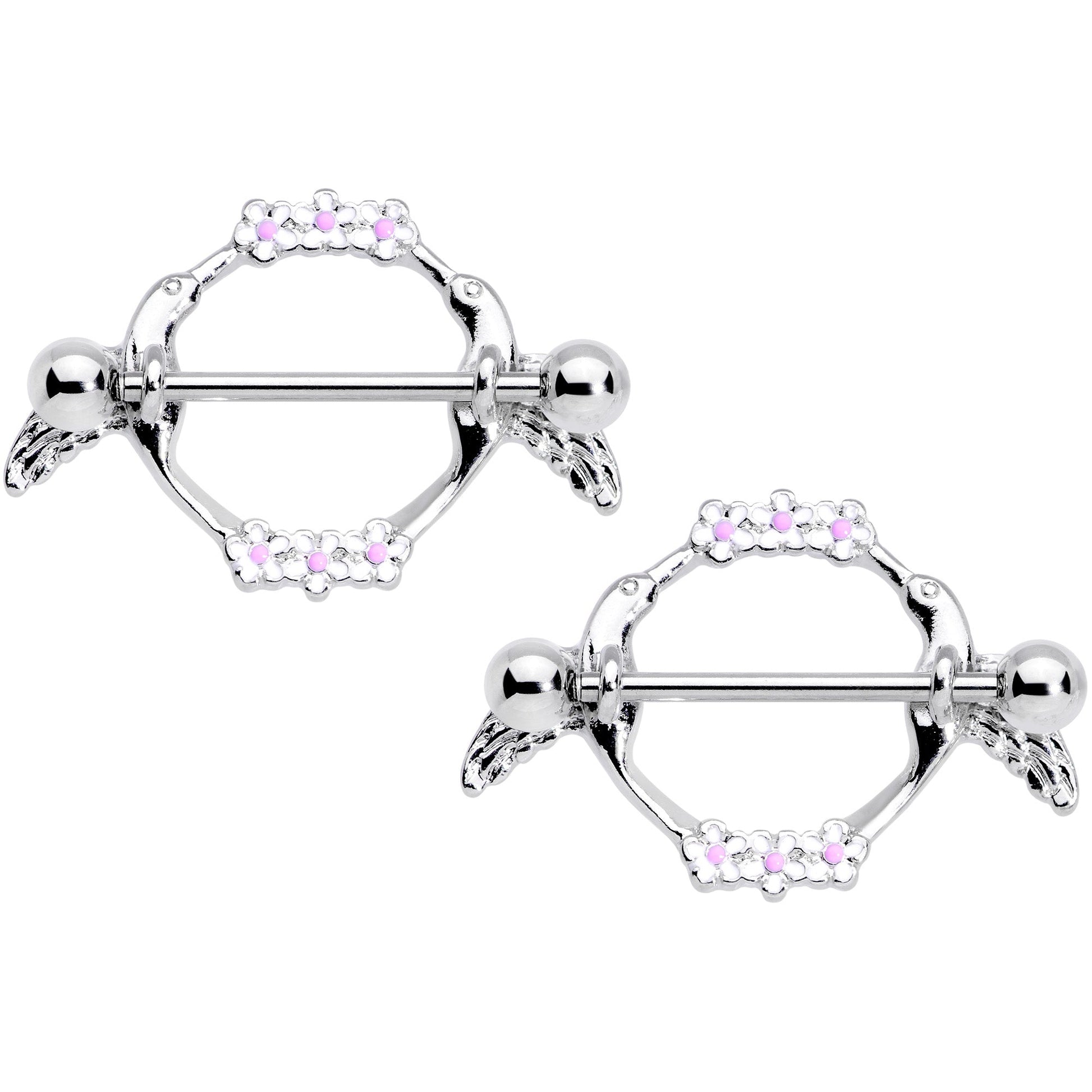These 14 gauge floral nipple shields are sure to make your spirit fly! They're made with 14mm durable 316L surgical grade stainless steel straight barbells with 5mm ball ends. The shield portion features a trio of white and pink flowers each at the top and bottom. The sides of the shields each feature hummingbirds appearing to suck from the flowers. Sold as a set of two.Specifications
