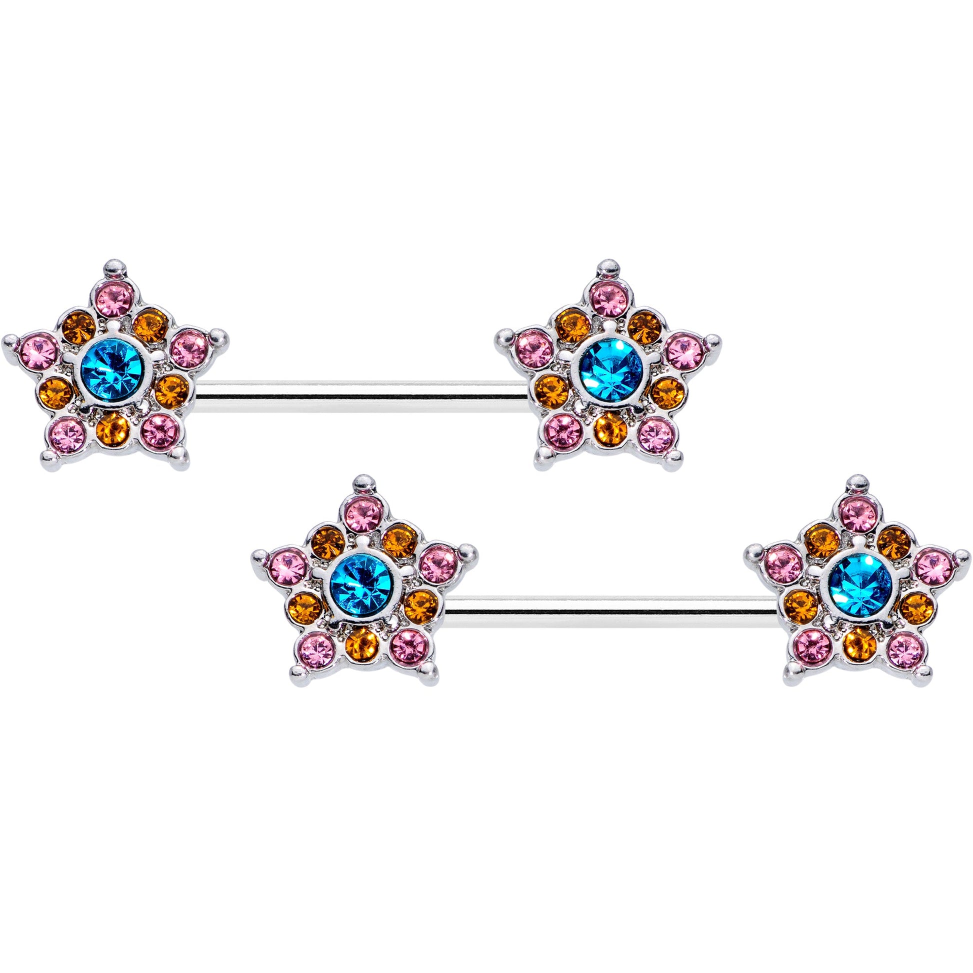 14G 9/16 Pink Yellow Blue Gem Showy Stars Barbell Nipple Ring Set
