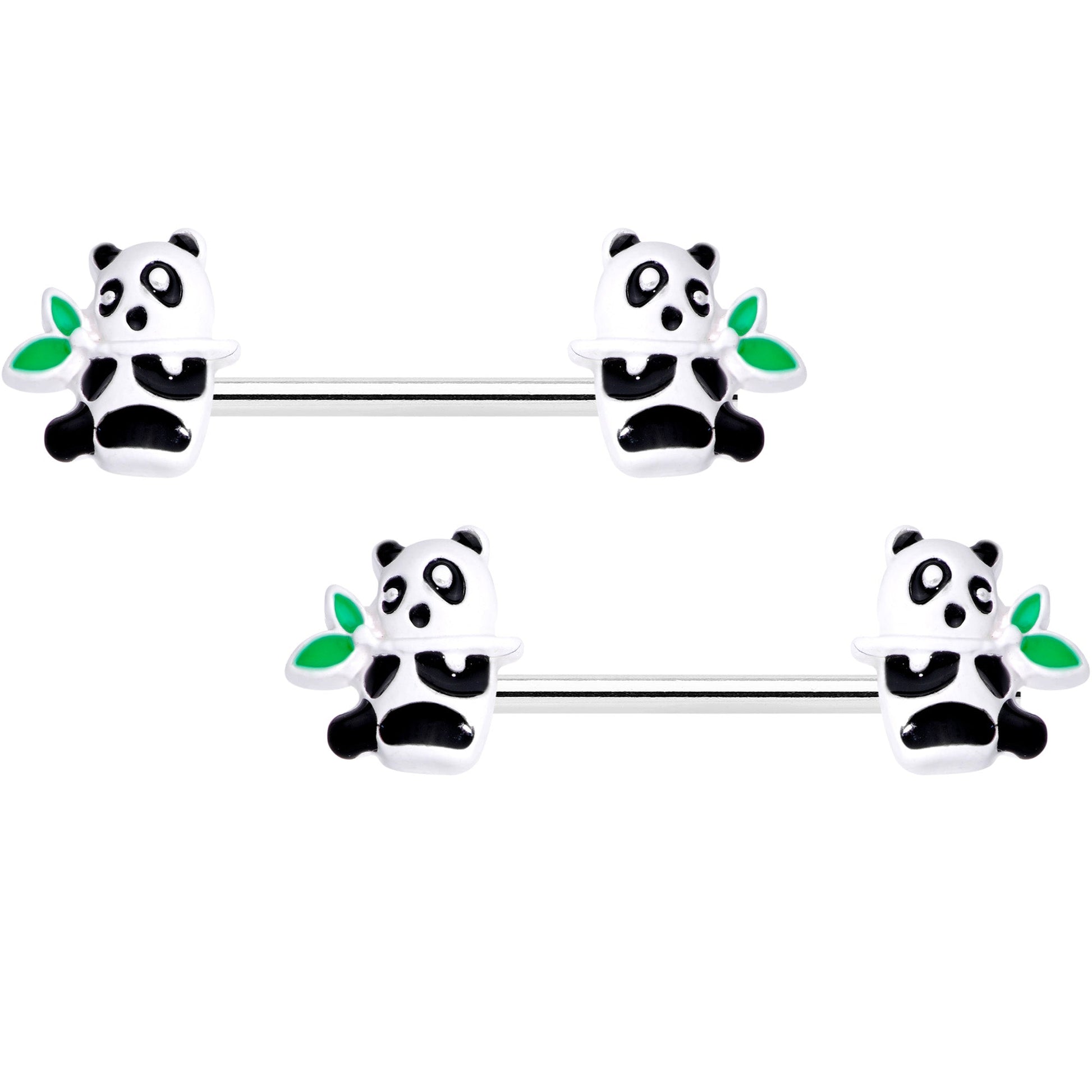 The pandas on this 14 gauge nipple jewelry are not only pretty, they're pretty hungry! They're made with 14mm durable 316L surgical grade stainless steel straight barbells. Each end features a panda charm, wearing their iconic black and white colors. The pandas are holding a piece of bamboo, detailed in green. They also feature a multi-dimensional, textured design that allows each detail to really pop! You'll be feeling just as pretty as these pandas with this jewelry in your nipple piercings! Sold as a set of two.Specifications